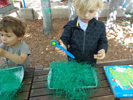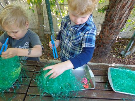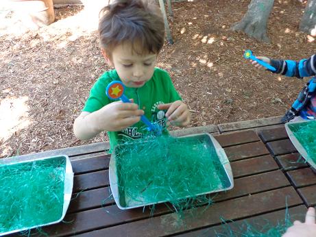 Every spring, migrating birds return to areas affected by snow and cold weather. These birds feast on the great flood of insects that return at the same time. Using tweezers, plastic bugs, and plastic grass, we pretended to be birds looking for these scrumptious treats. Before we began this activity, we talked about why bugs are important during this time of year. Your little one learned that a wide variety of flowering plants and songbirds owe their existence to these tiny creatures. They not only pollinate plants, but transport organic compounds throughout the soil. This activity encouraged fine motor development, the application of new subject matter, and hand-eye coordination.