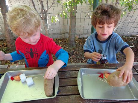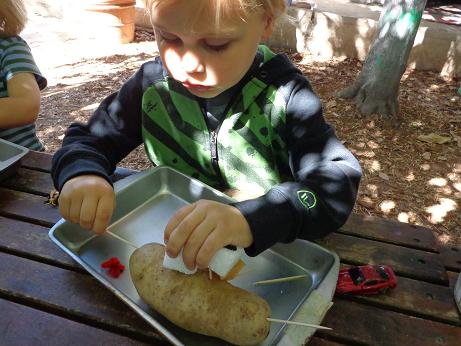 This activity was the favorite of the week, as your little one constructed their very own creatures out of potatoes! This activity honed in on their hand-eye coordination and fine motor skills! As they arranged and rearranged a variety of facial features, your little ones manipulated space and made their visions come to life!