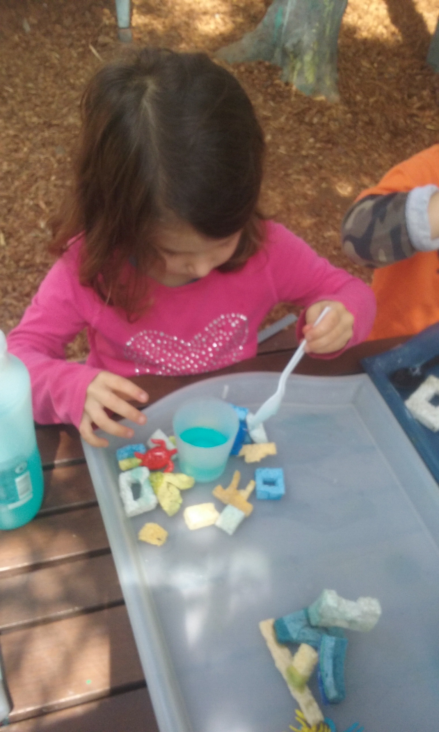 To recreate this scenario in the classroom, we used food coloring, eye droppers, water, and a plastic octopus to examine the effectiveness of this primitive defense.