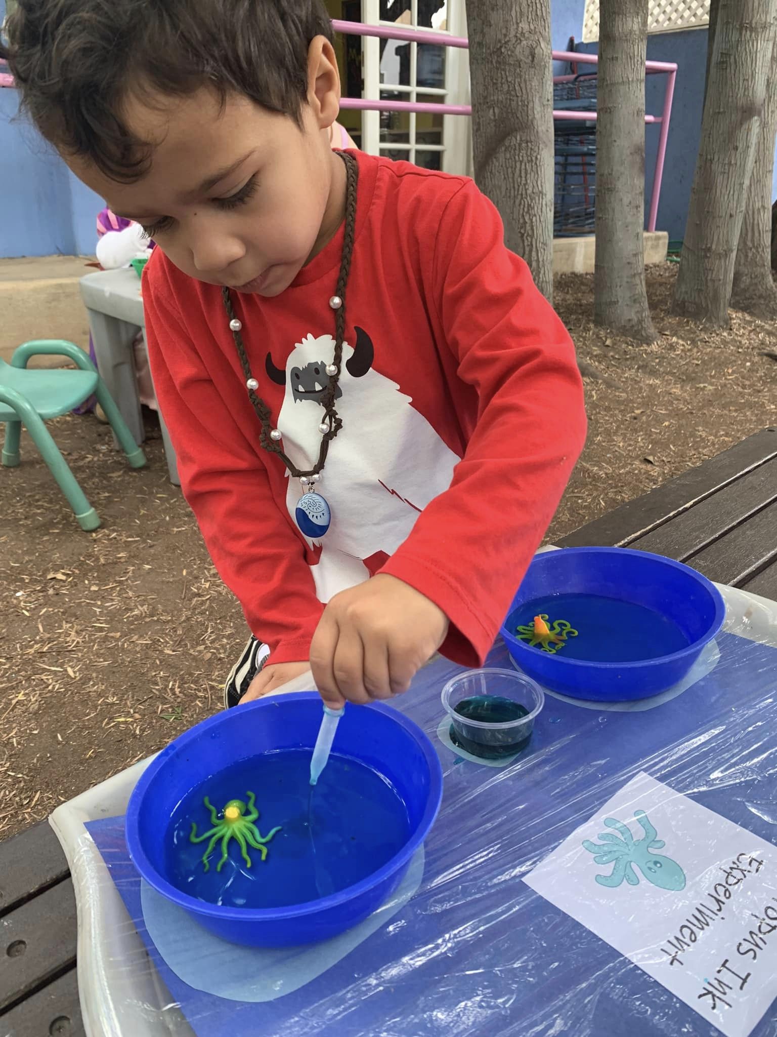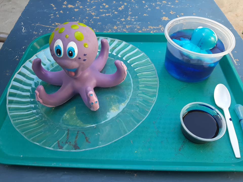 To recreate this scenario in the classroom, we used food coloring, eye droppers, water, and a plastic octopus to examine the effectiveness of this primitive defense.