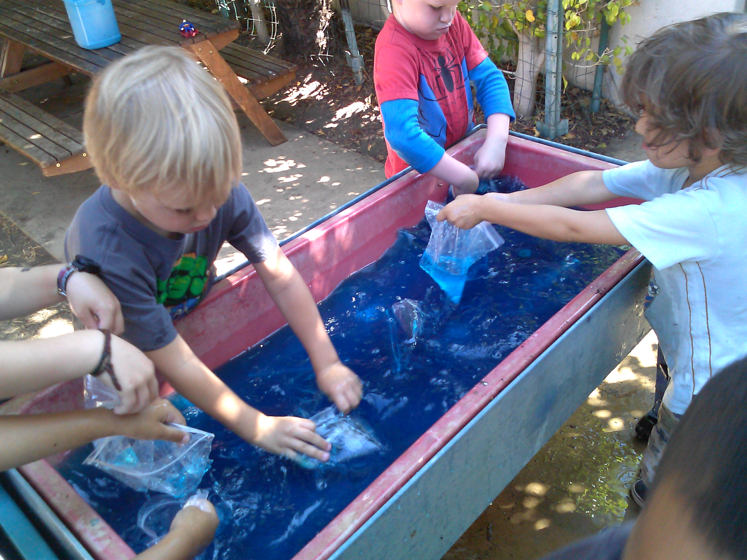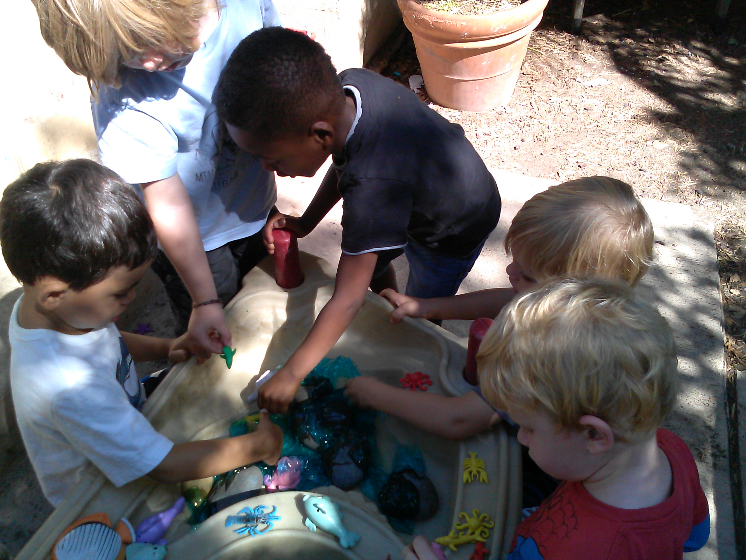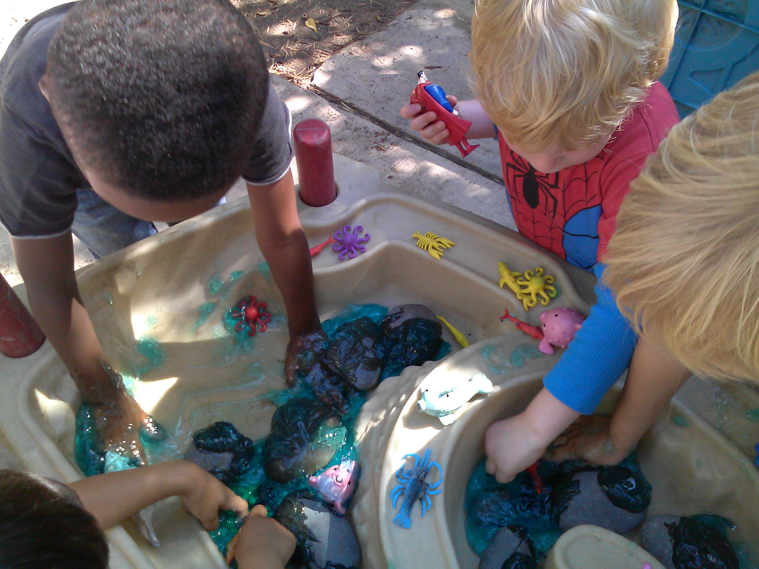 The Ichthyosaurus was a marine reptile that roamed the prehistoric seas. These massive creatures ranged from seven to thirty feet, and used their massive dorsal fin and powerful flippers to navigate. To introduce the concept of friction and its relationship to speed in the water, we swam with our very own flippers! We initiated this activity by placing our hands into some water to make waves. We then placed Ziploc bags onto our hands, and did the same thing. We followed this with a discussion of the differences between the two. Our conversation consisted of questions such as “What made bigger waves, when we had bags on our hands or when we didn’t?” and “Why do you think the bags made bigger waves?”. This activity facilitated several developmental areas, including deduction, cause and effect, and cooperative learning.