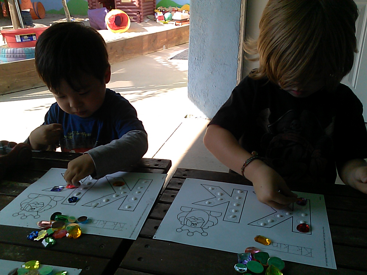 Fine motor activities develop slowly in young children. Because of this, it is imperative that they are constantly exposed to experiences that enable them to practice these important skills. They are an important precursor to writing. Using jewels and worksheets, your little one placed jewels to make the letter K!