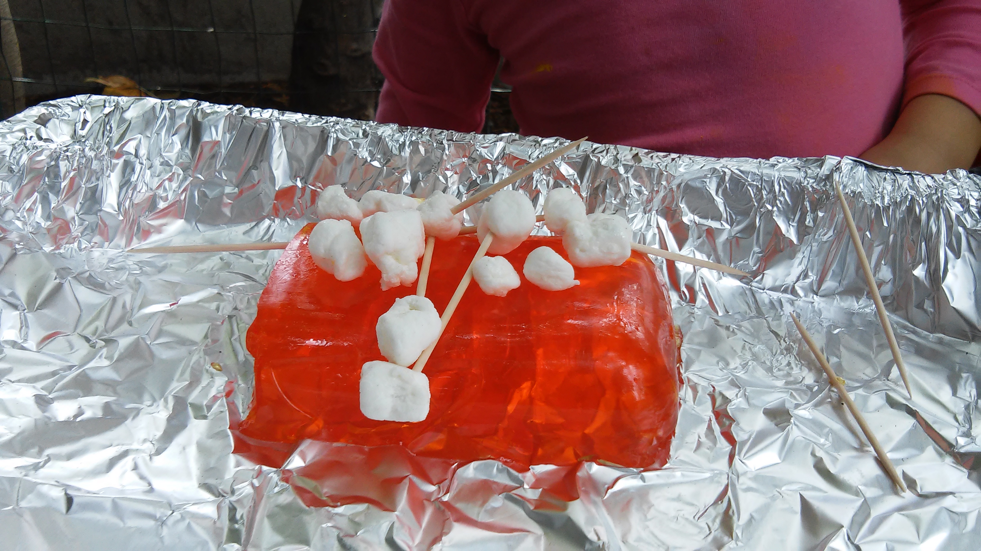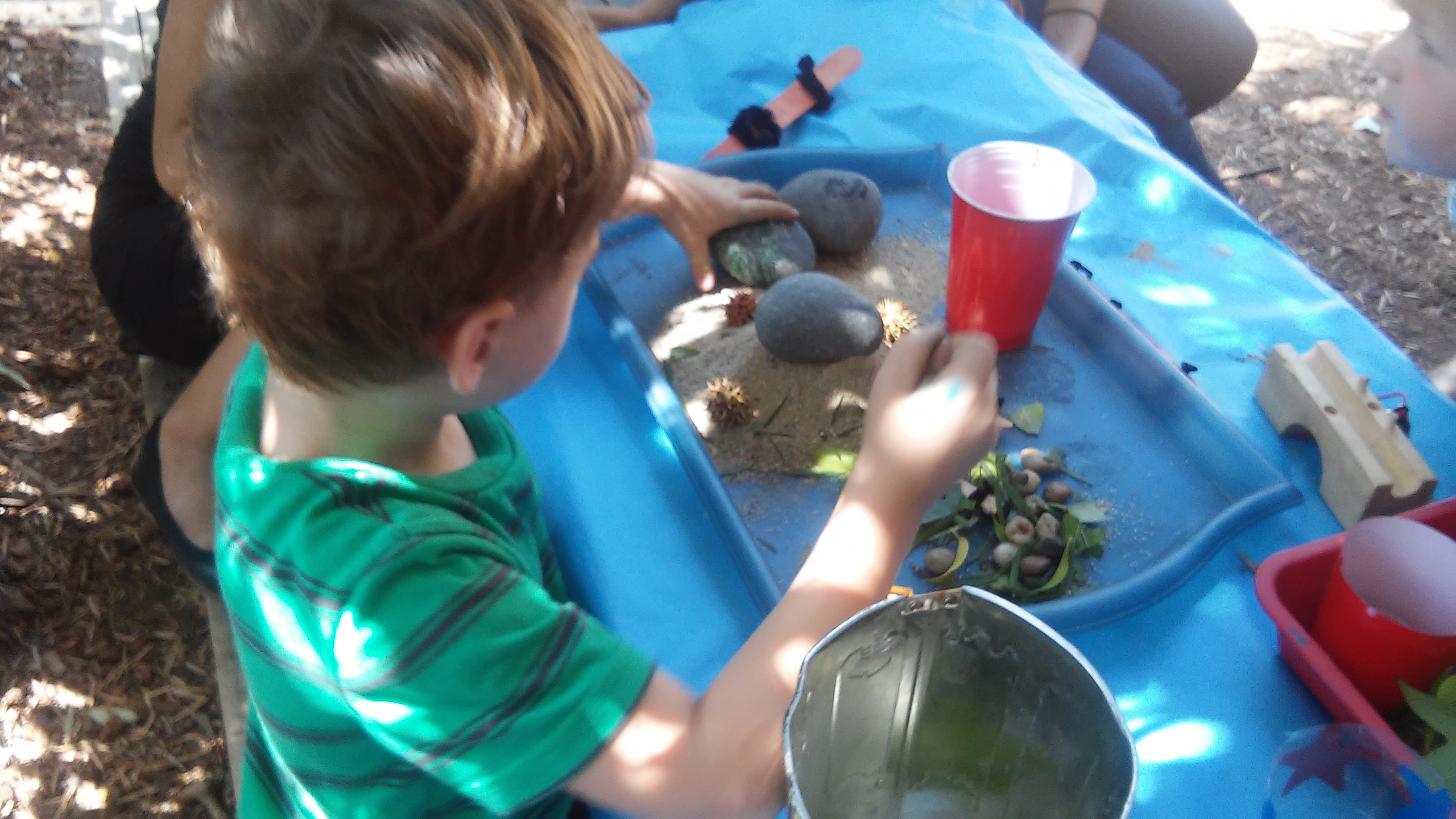 Your little one learned that if you are outside during an earthquake, it is important to get away from buildings, overpasses and power lines. To help convey this concept to our class, we created little villages with power lines, and structures that we used to protect our people. Your little one began this activity by spreading dirt onto a tray. They then used sticks and yarn to create electric poles. Next, we used small branches to simulate trees, and blocks to represent houses.