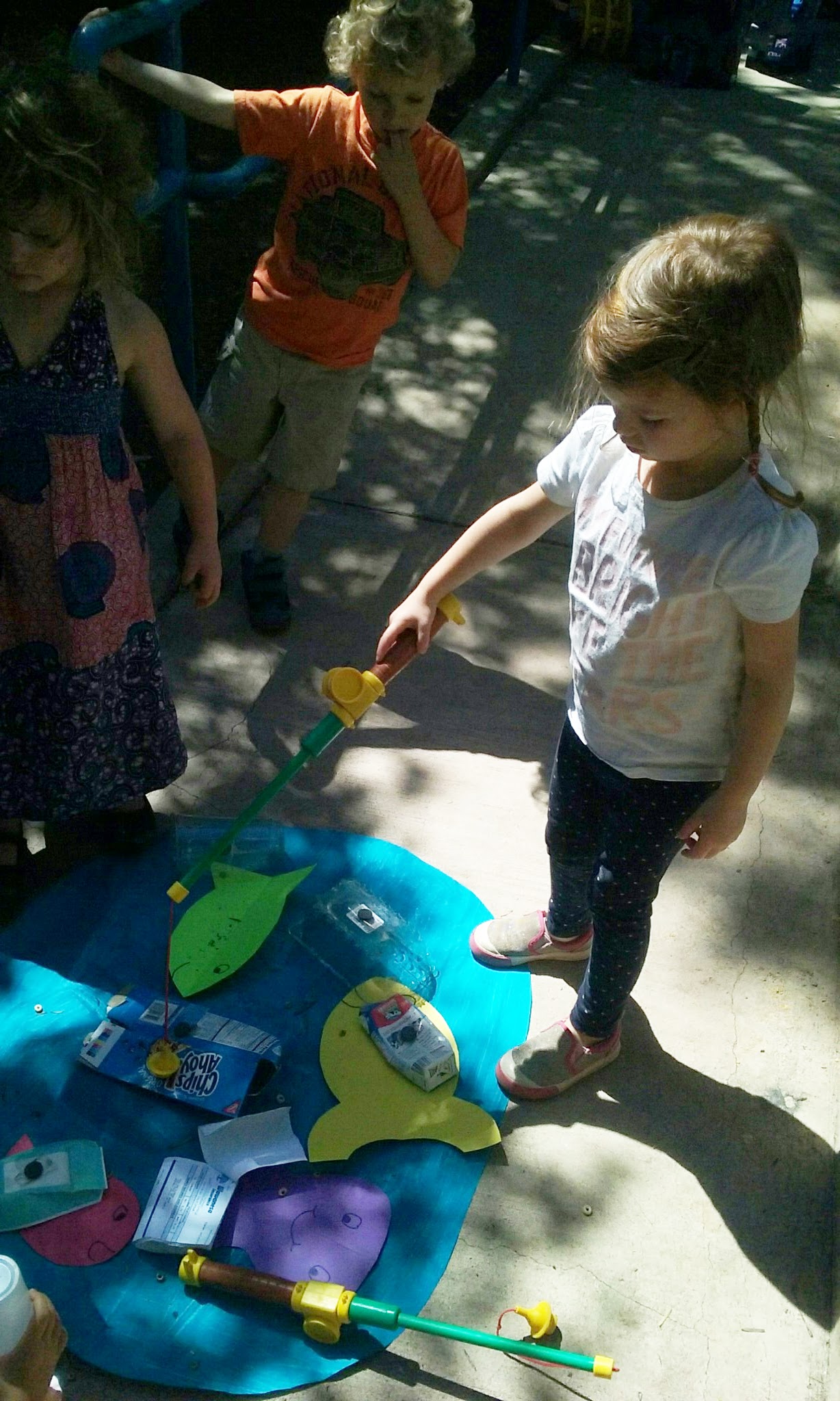 As each child caught a fish, we flipped it over to see what was on the bottom of the fish and asked questions like – “Is this good for our fish?” or “Does this belong in the pond?”