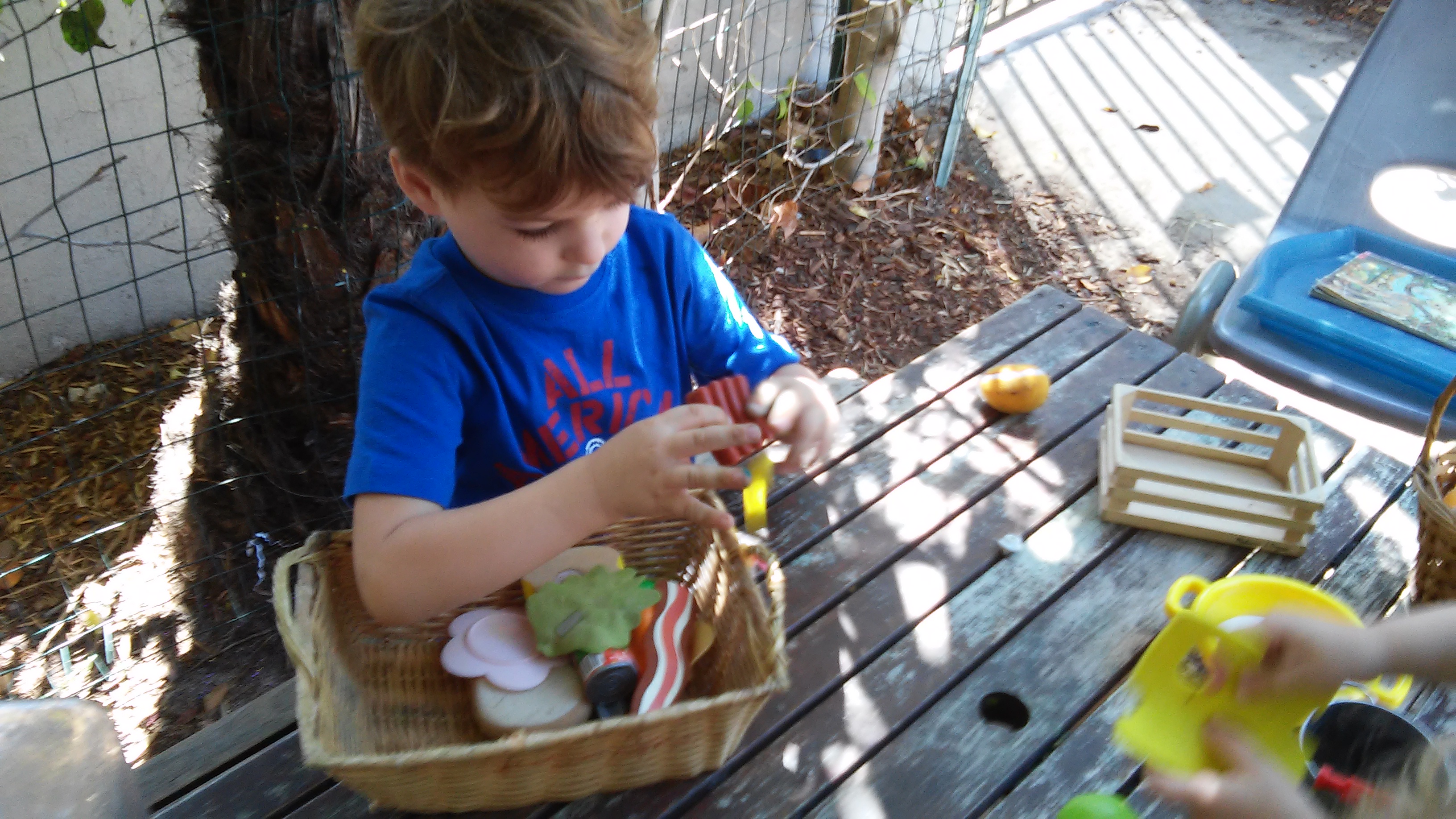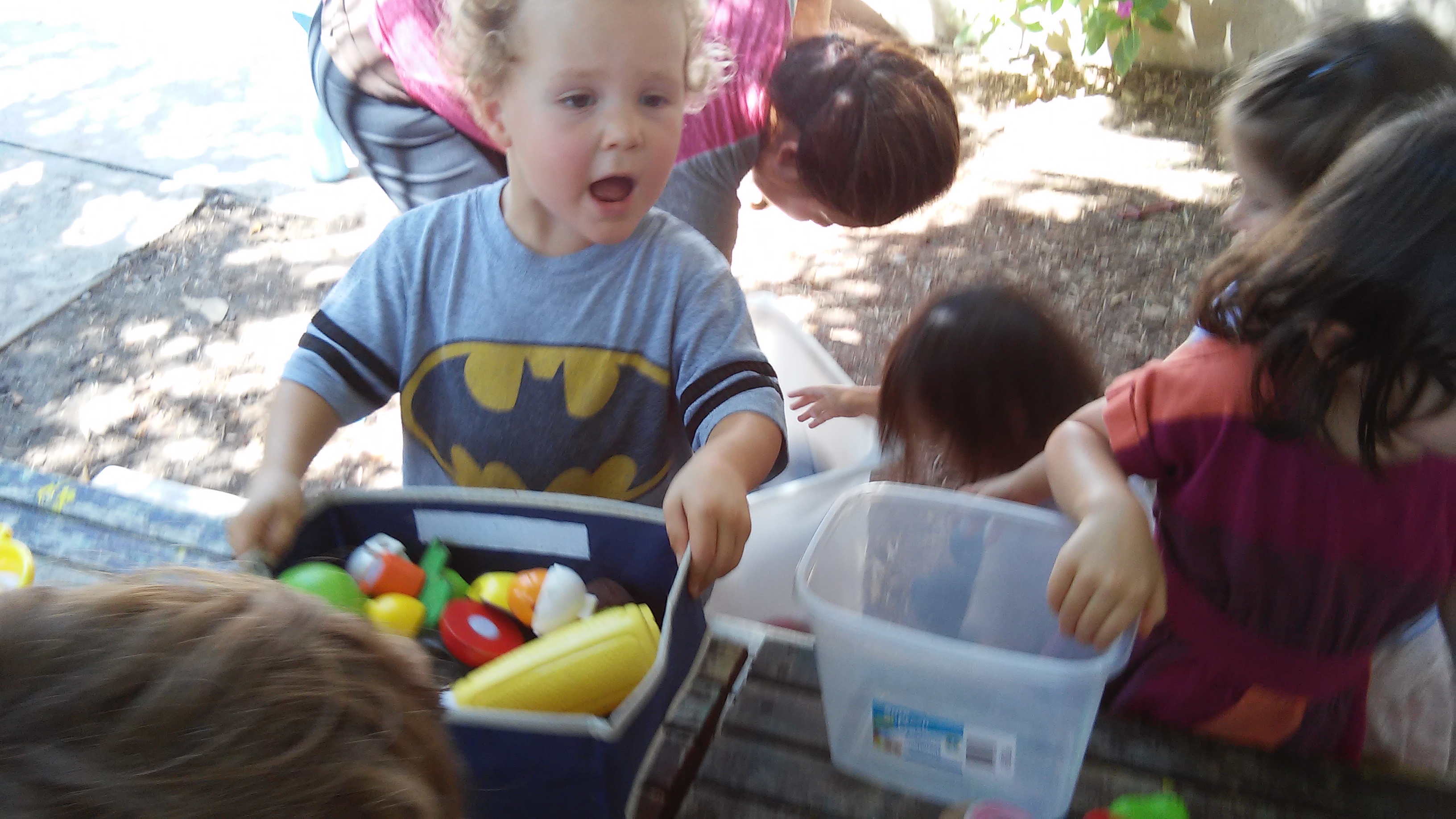 For this component, we had bins and bowls filled with band-aids, plastic food, bottled water, toys, and flashlights. Your little one was given a wooden crate to use as their “kit”, to place their necessary items inside. Before the “hurricane” commenced, your little one was urged to check on their friends, and as a group, go into the playhouse with their kits.