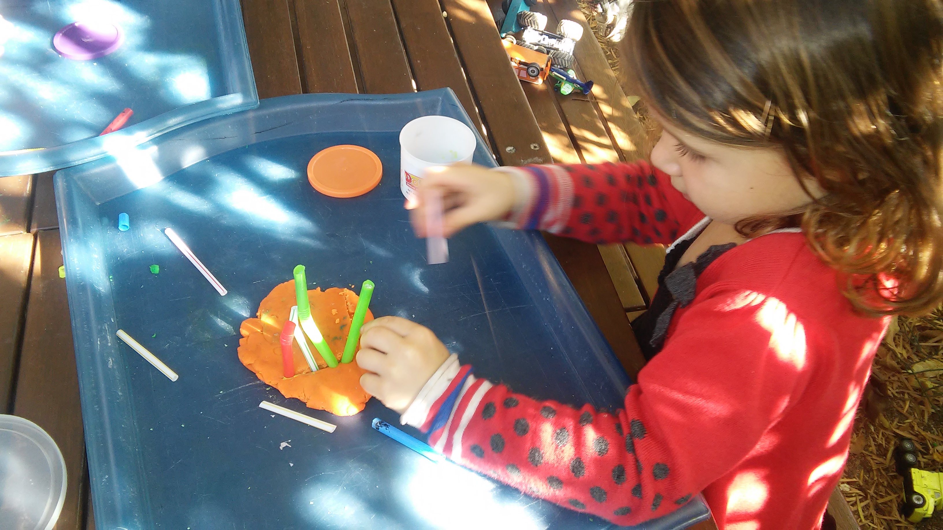Many children feel that practicing handwriting is a chore, an unwanted burden and something they dislike spending time on. With all the technology and electronic devices we have today, it almost seems like handwriting is becoming irrelevant. In our class, it isn’t. There are several ways to form letters, and in our class, we learn to construct them properly without even using a pencil! As your children are introduced to letter formation, they benefit most from a hands-on approach using manipulatives. Even before children can properly grasp a pencil they can practice this way and get a feel for the way a letter should be formed. Miss Carrie models the correct formation with the children and then lets them explore and in essence “create” letters. For this particular activity, we practiced creating letter Ls with Playdoh and straws. Each child poked straws into the Playdoh to create the letter L.