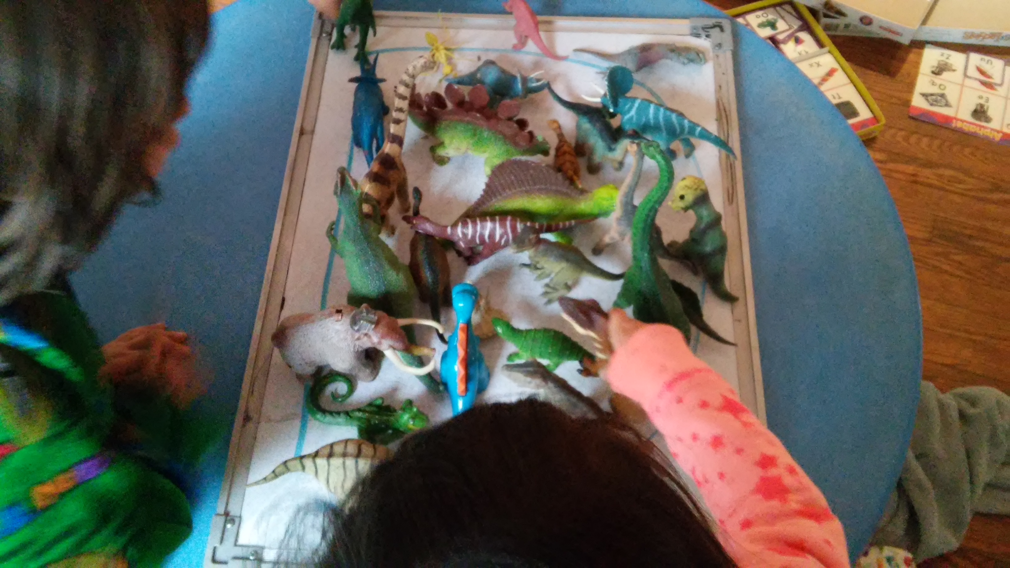 To help make this activity fun and memorable, our task was to place dinosaurs inside a large letter D. By doing this, your little one incorporated several developmental domains. They not only accessed their ability to evaluate space (How many blocks will fit?), but were given an opportunity to work with their peers.