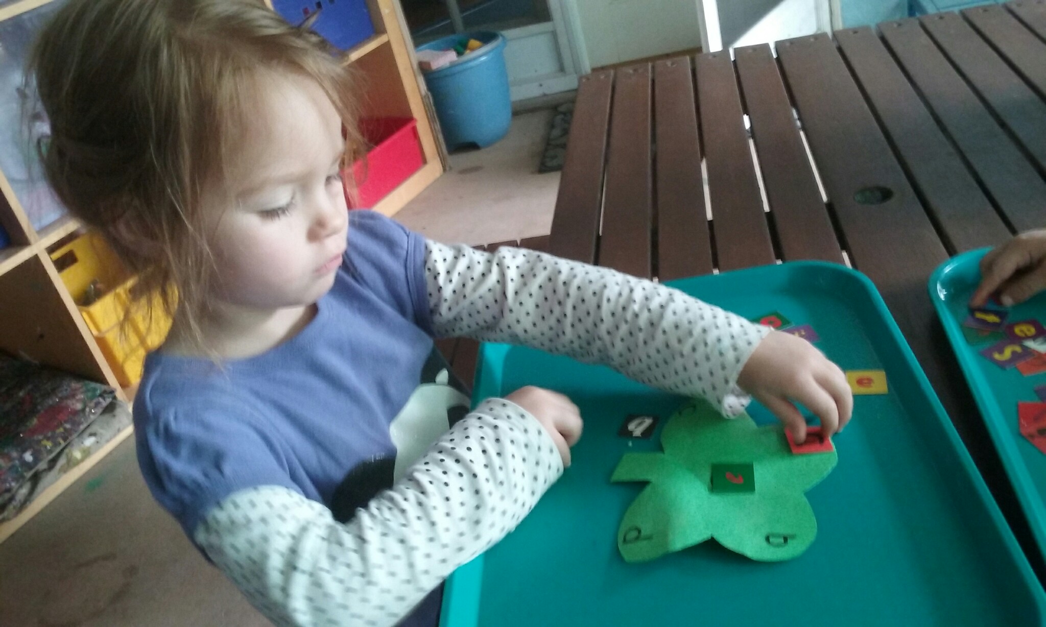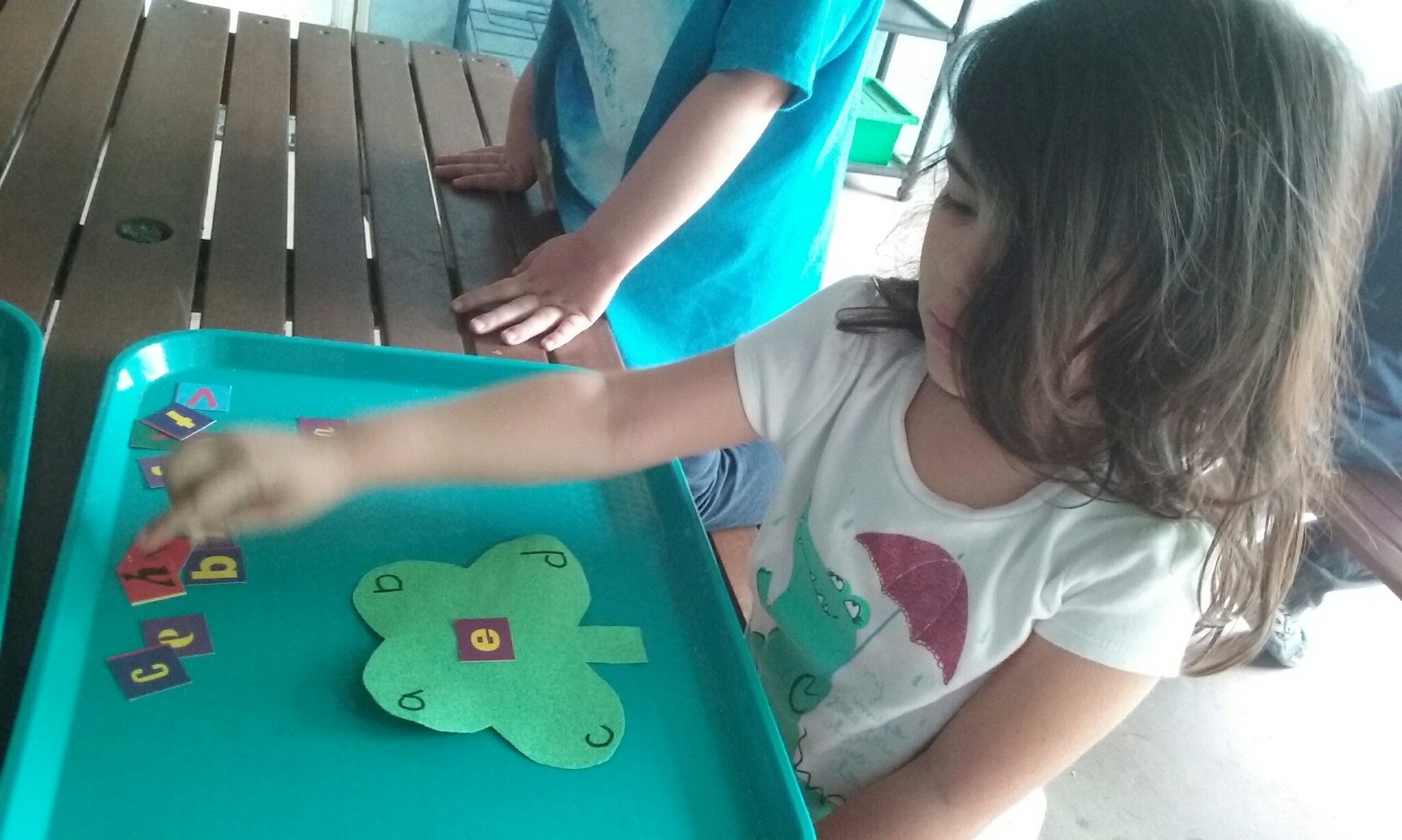Young children learning letters need vivid, concrete language to understand the abstract component of the written word. For this activity, we practiced matching cardboard cutouts of letters to letters written on a four leaf clover.