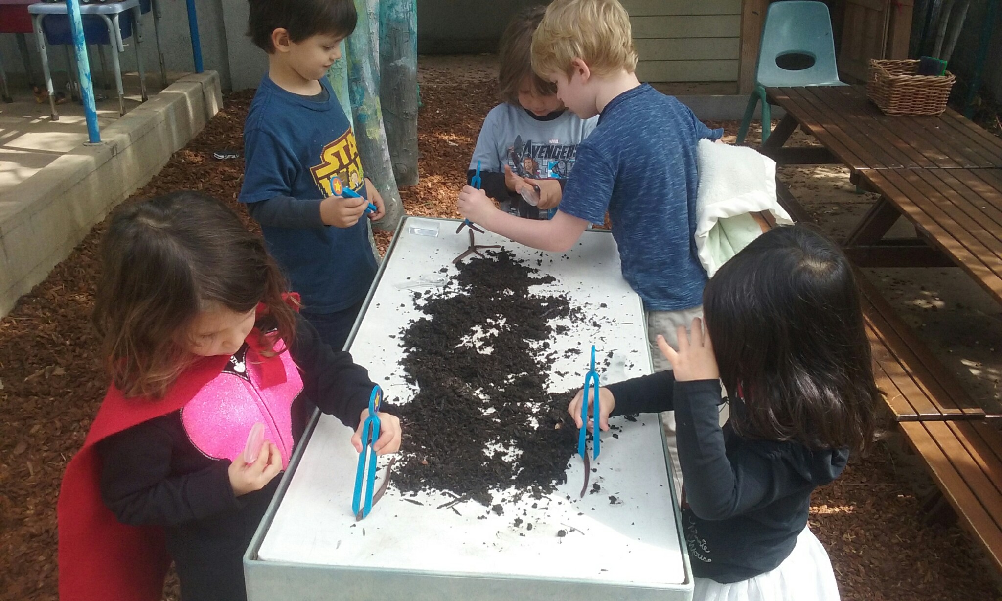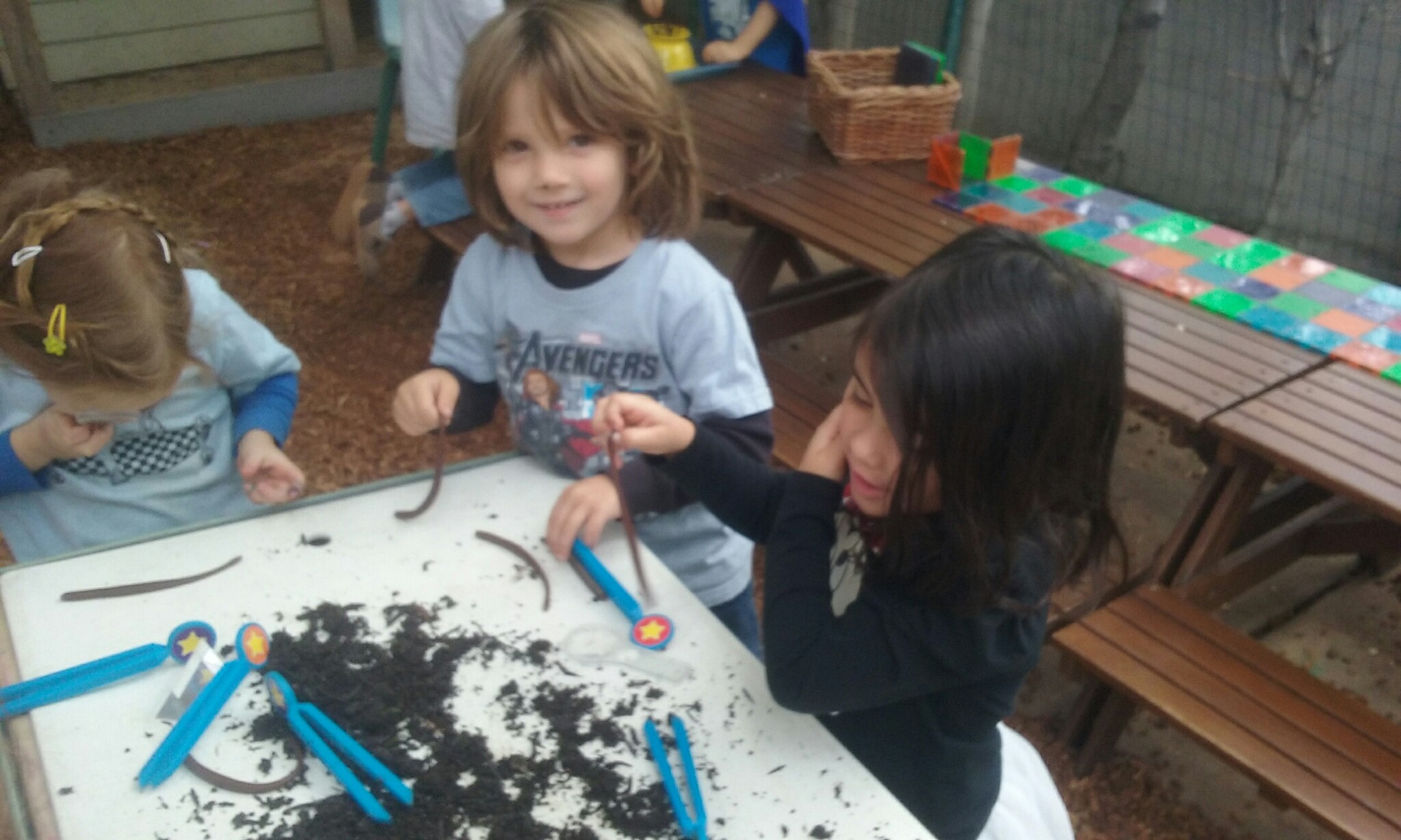 Following that, we practiced our observation skills by posing the worms in various positions that we thought may help them eat, sleep, and wriggle around. Some children created little hills for them, others placed them underneath the dirt, and others thought they would enjoy going inside the water table.