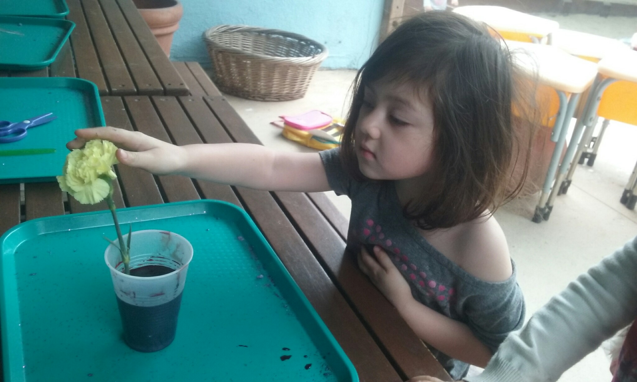 They were then asked to pour colored water into several bowls and place white carnations inside.