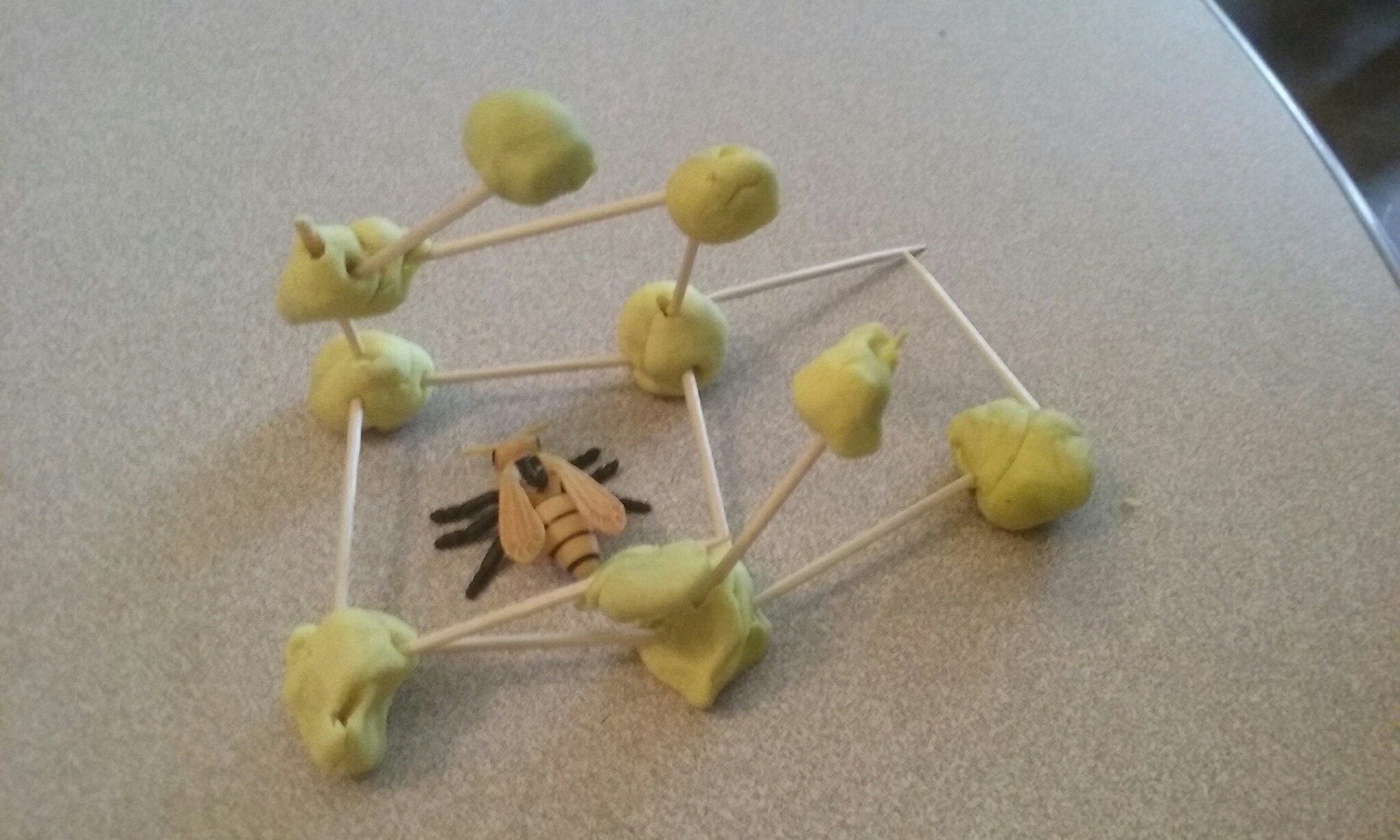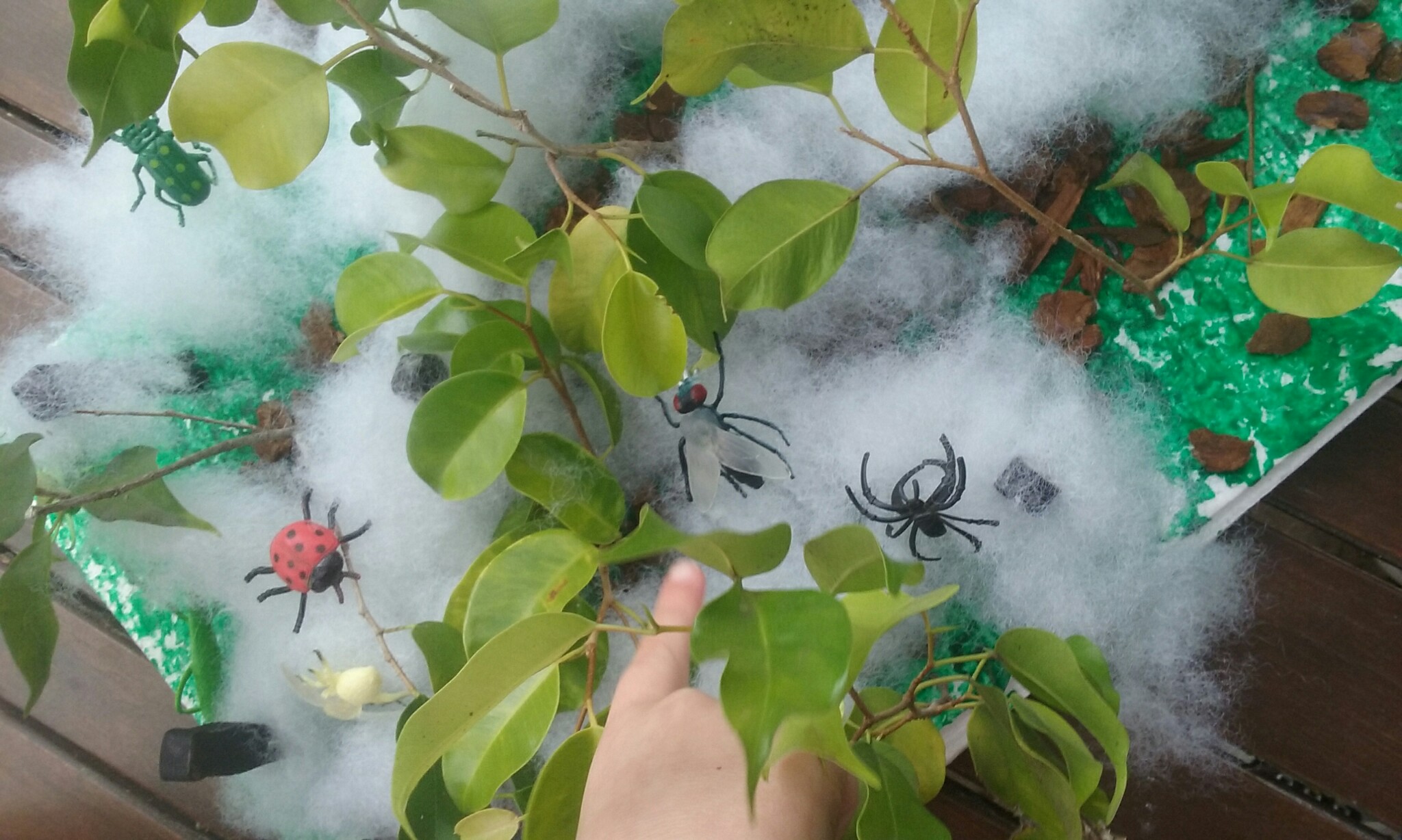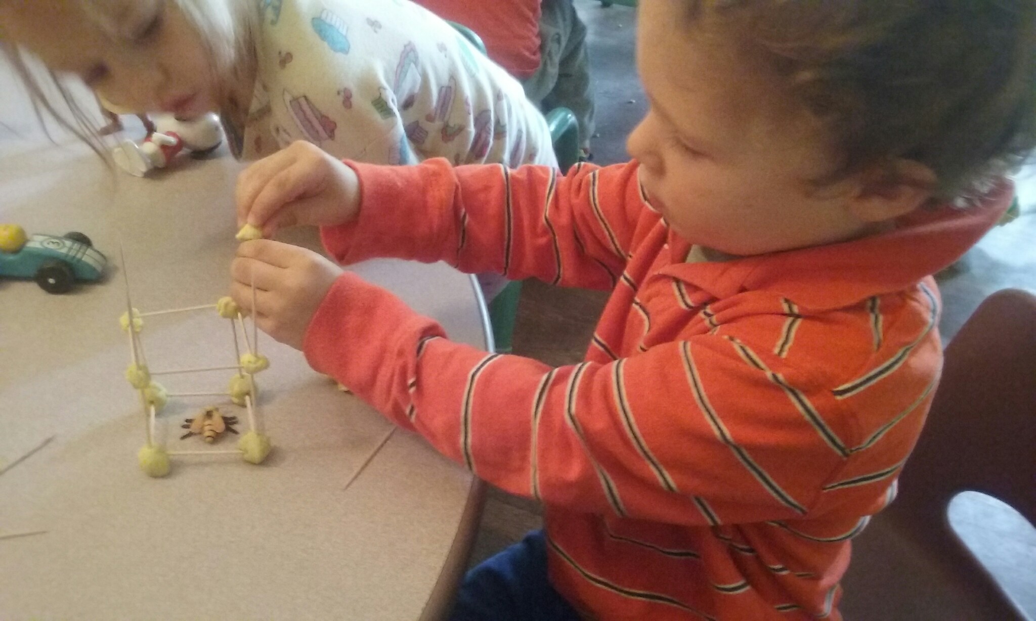 Using string, sticks and play dough, we created our own webs, and then your little ones attached spiders to a web that Miss Carrie made using string and a hula hoop!