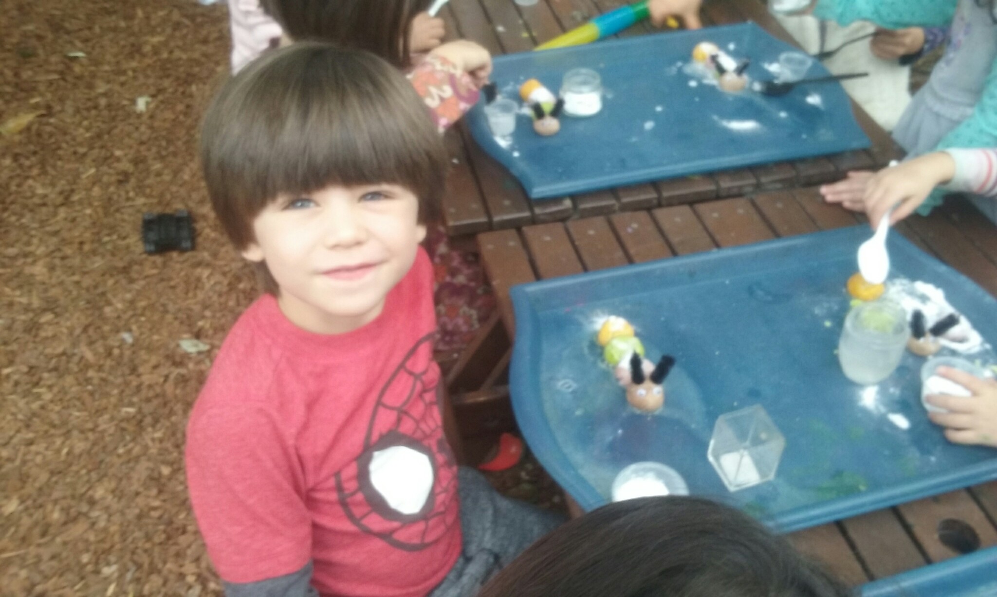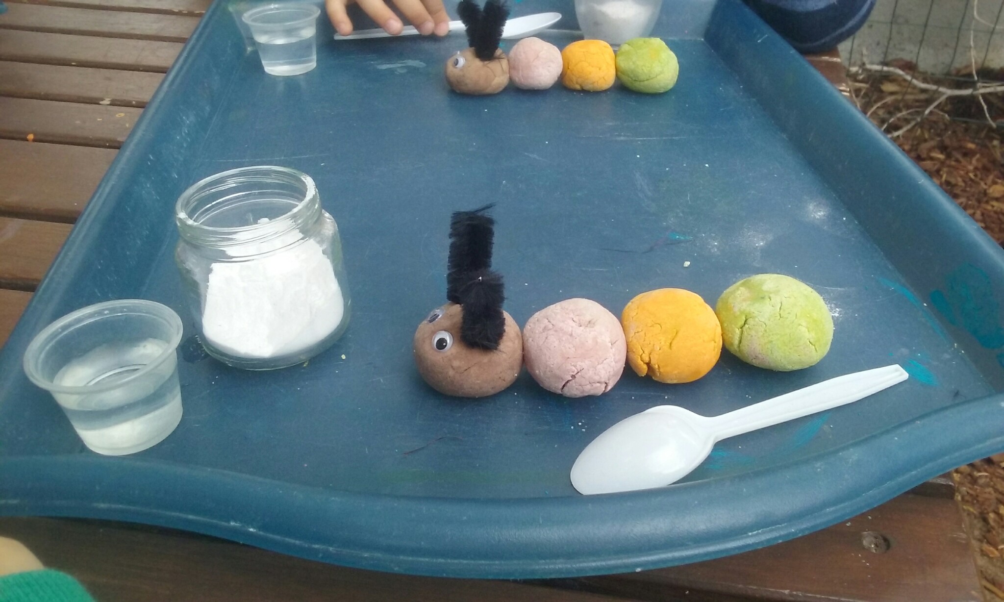 First we made caterpillars with playdough and added pipe cleaner antennae and googly eyes. While we made our caterpillar we counted each ball and talked about the simple color patterns we were creating with them. Next, your budding entomologist made a good sized thumbprint in each caterpillar segment. While we made our thumbprints we counted our playdough balls again. Then, we filled the thumbprint sized hole with baking soda and added one drop of food coloring to each hole. Then, the students were asked about what was going to happen.