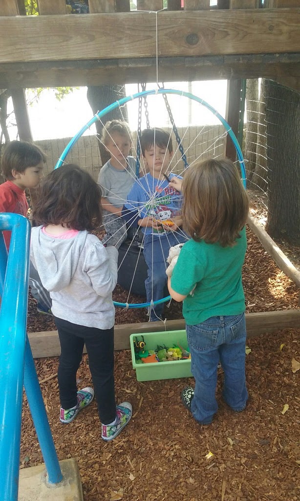 Using string, sticks and play dough, we created our own webs, and then your little ones attached spiders to a web that Miss Carrie made using string and a hula hoop!