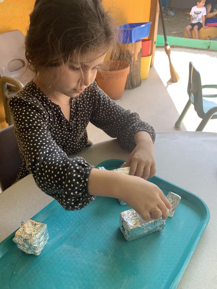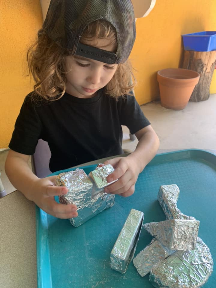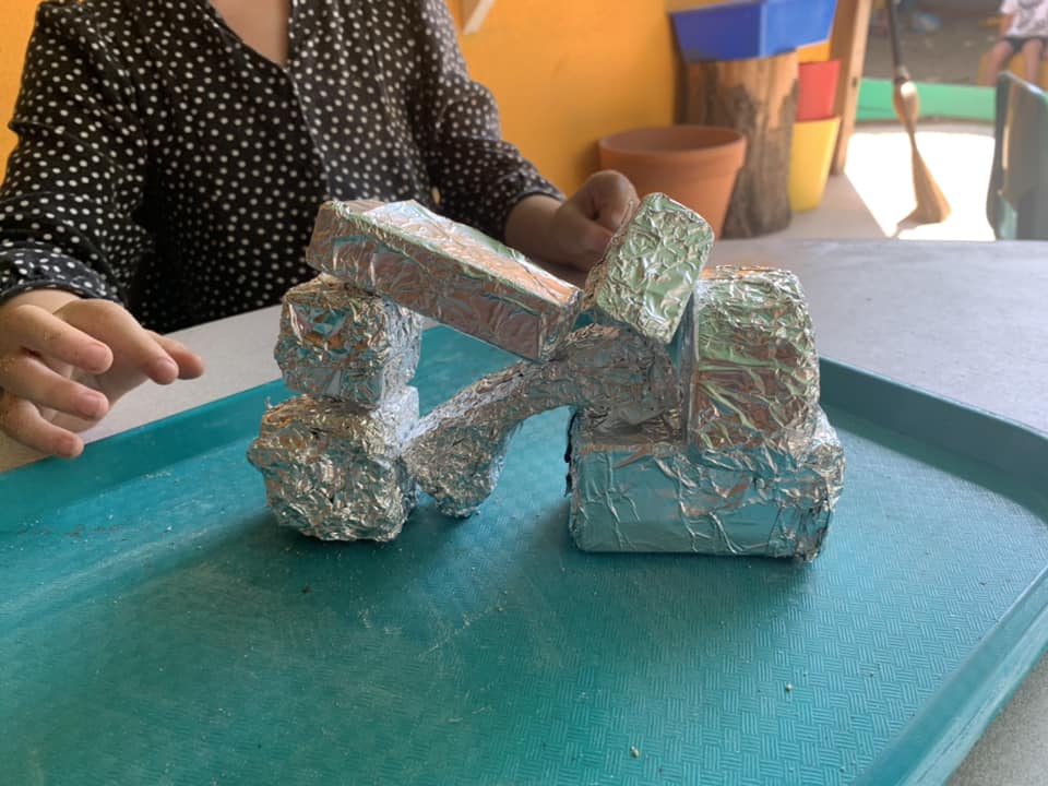 Hands-on learning is an integral component in early childhood education. The manipulation and experimenting of materials provide a reference of learned concepts, and enables young children to construct meaningful experiences that aid their ability to commit new information to memory. For this activity, your little one learned about how rockets are built. To help them connect with this idea, they created rockets out of blocks covered in aluminum foil.