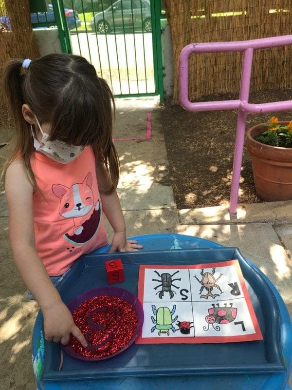 With the aid of colorful illustrations, students learned how to spin a dice, recognize a letter, and then match that letter with an item! To tie this in with Beetle Week, we used a beetle-themed dice.