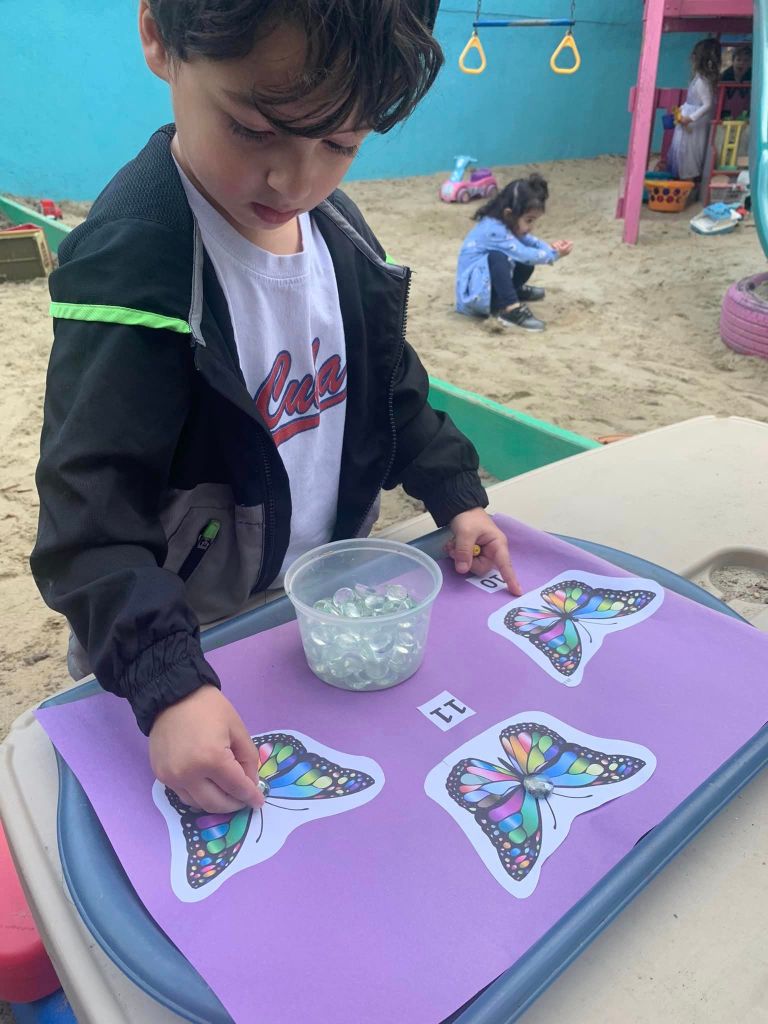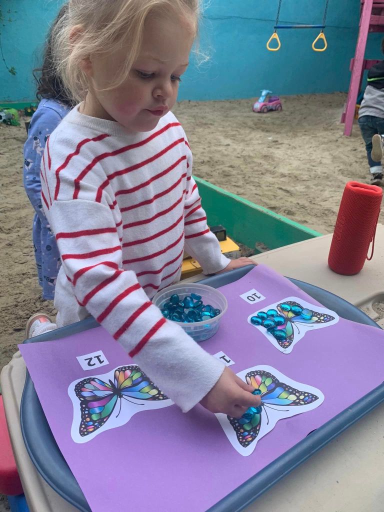 To learn both about butterfly wings (and to incorporate our math domain) your little ones placed “scales” onto three different butterfly cut-outs.