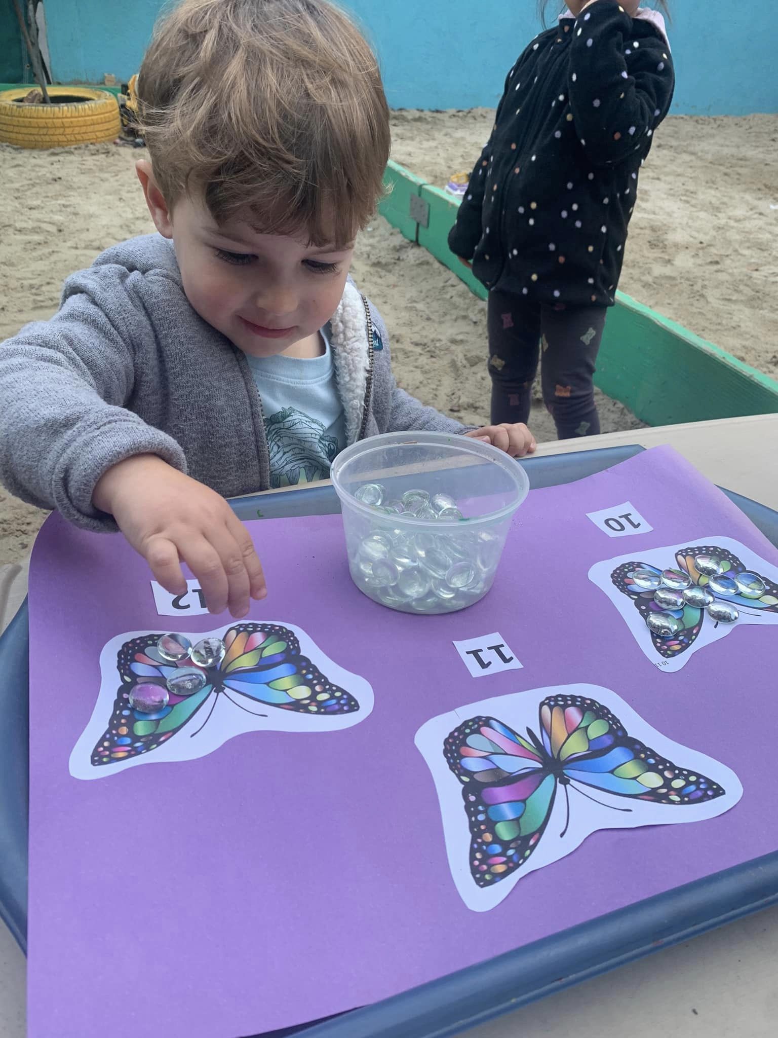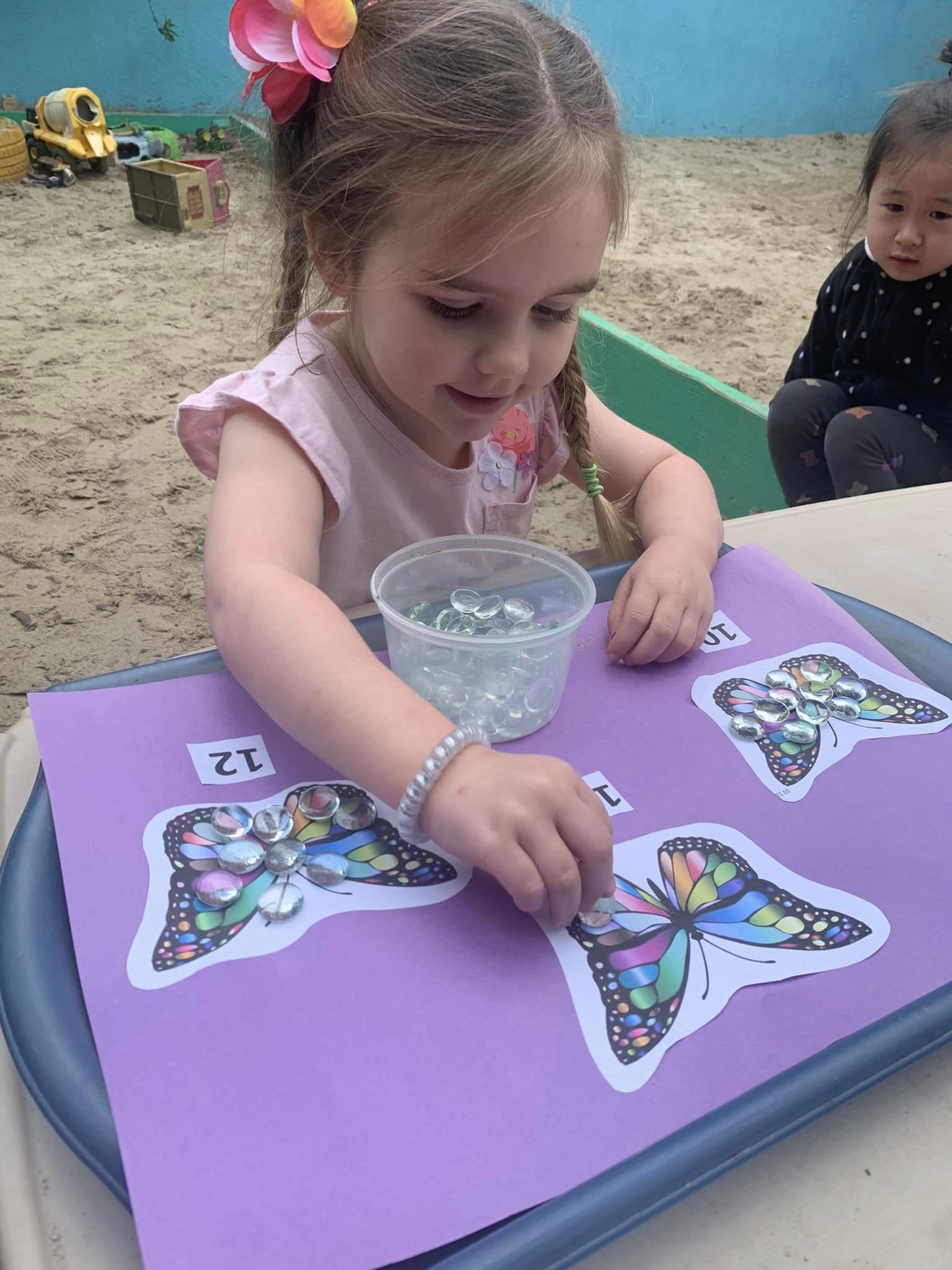 To learn both about butterfly wings (and to incorporate our math domain) your little ones placed “scales” onto three different butterfly cut-outs.