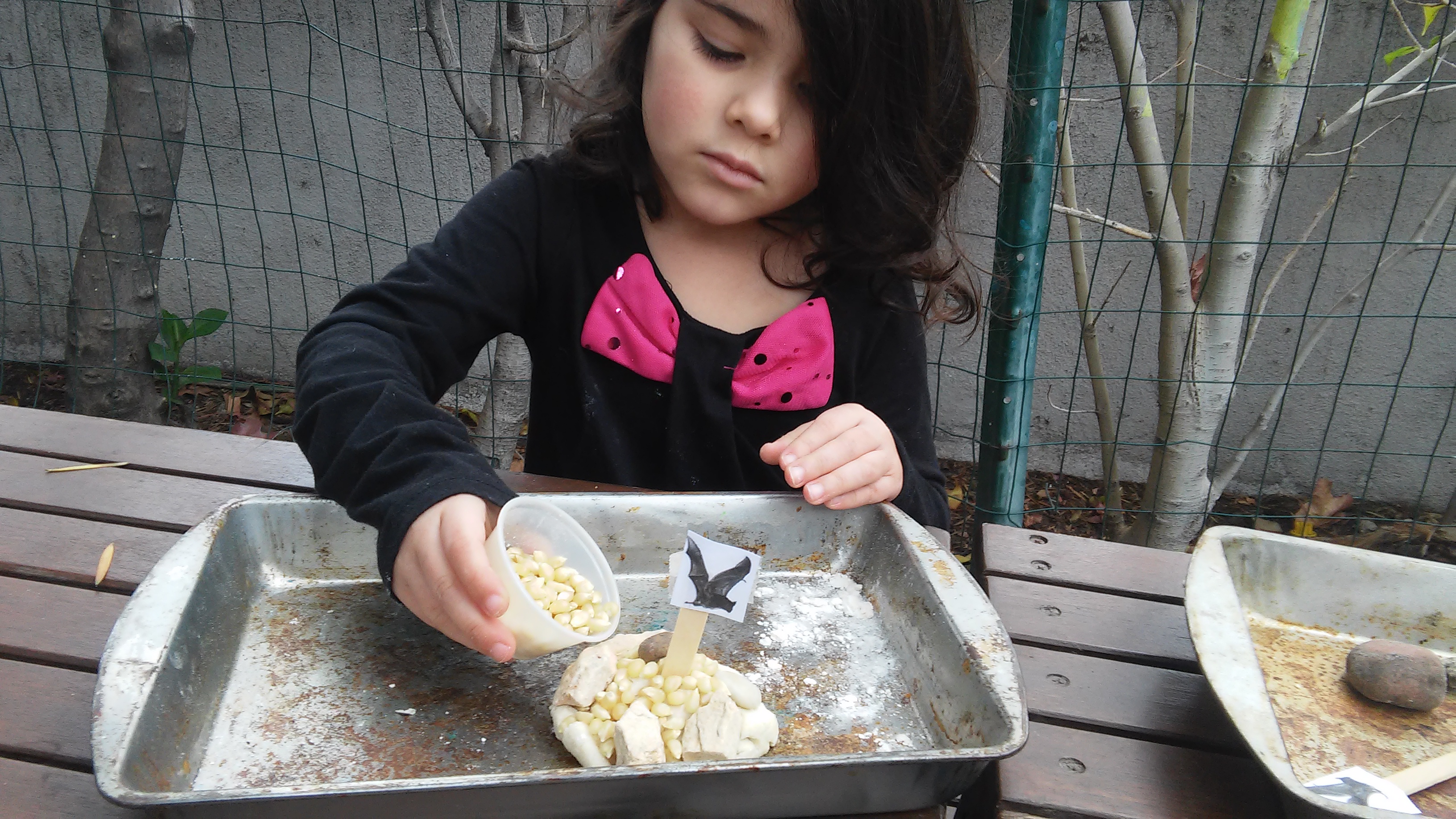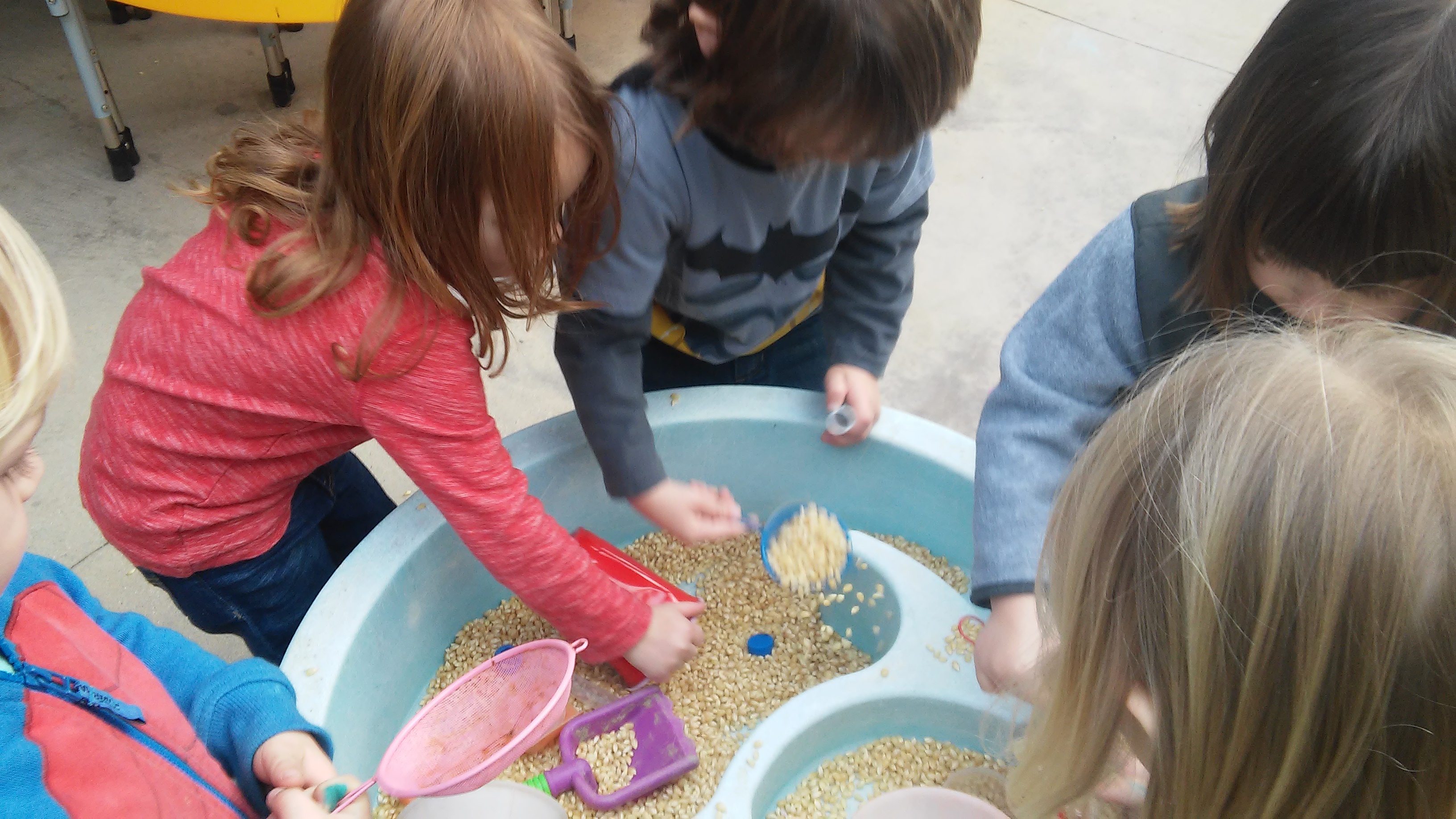 Through observation and practice, they learn that gravity pulls the kernels down a tube and pulls them through a funnel. They learn that different materials have different textures, and that objects interact with each other in different ways.