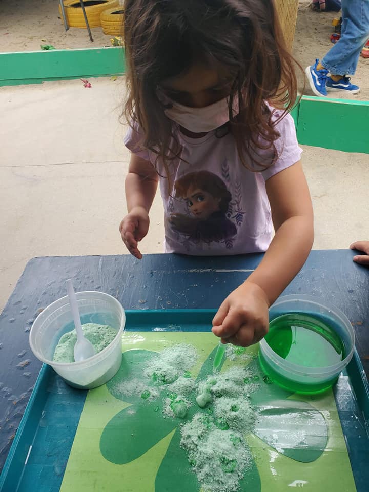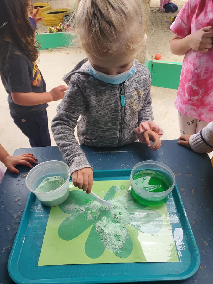 Using a play dough mat, eye droppers, vinegar, and baking soda, students observed what happens when different ingredients are combined.