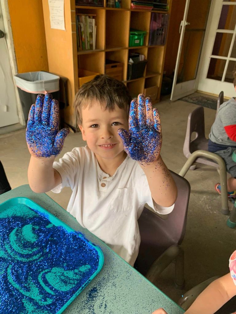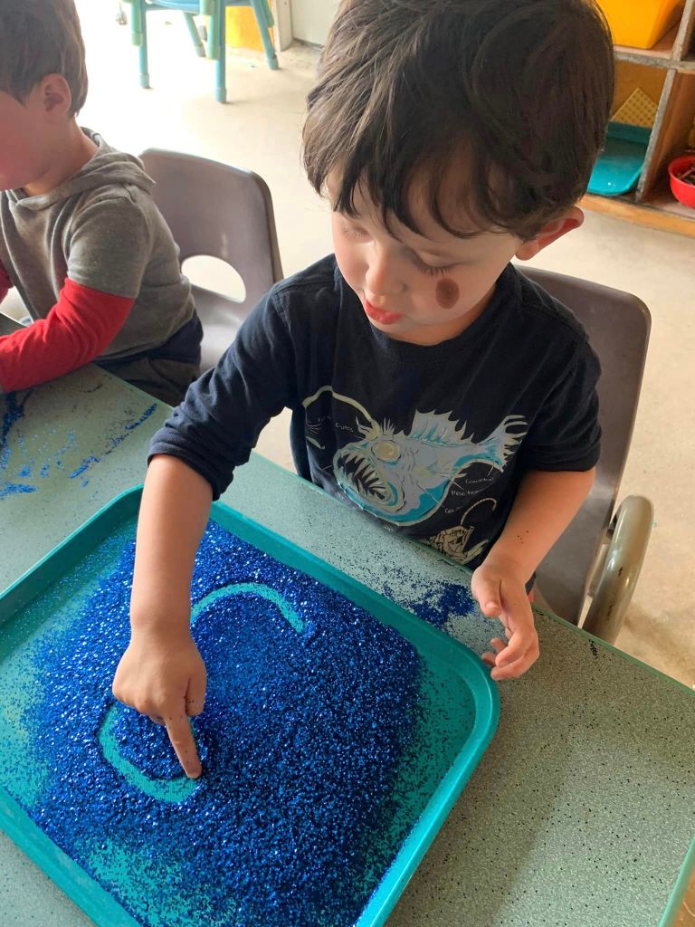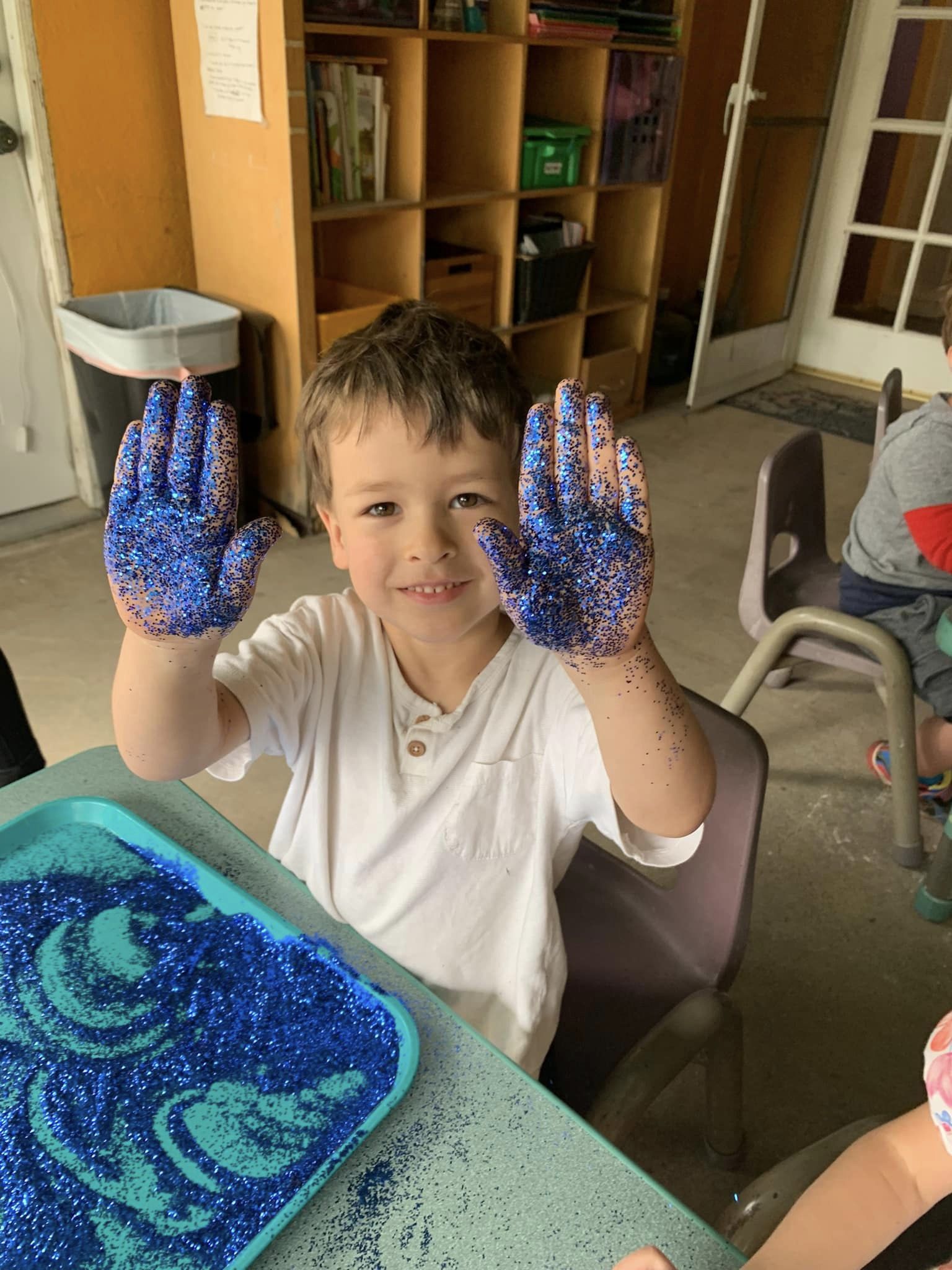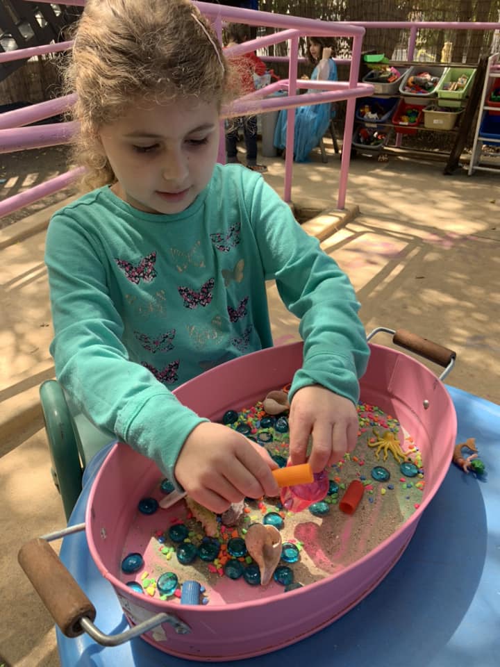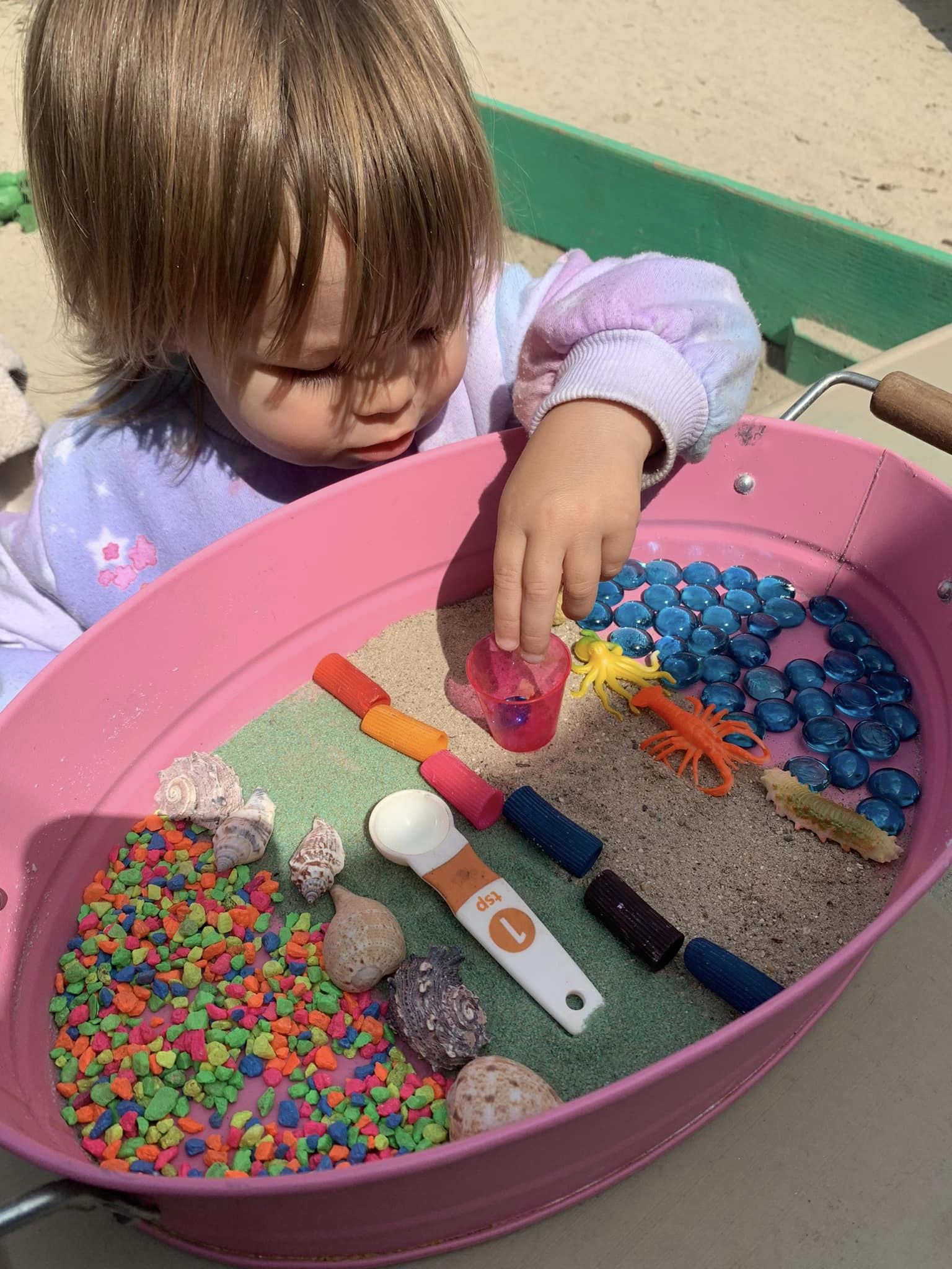 We filled up this water table with water, watercolors, glitter and shaving cream.