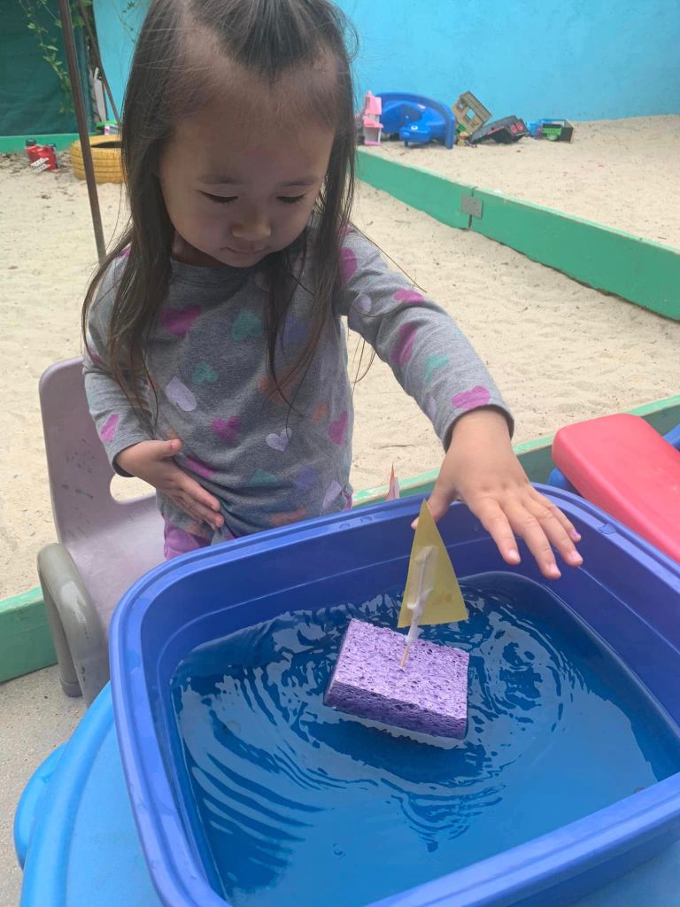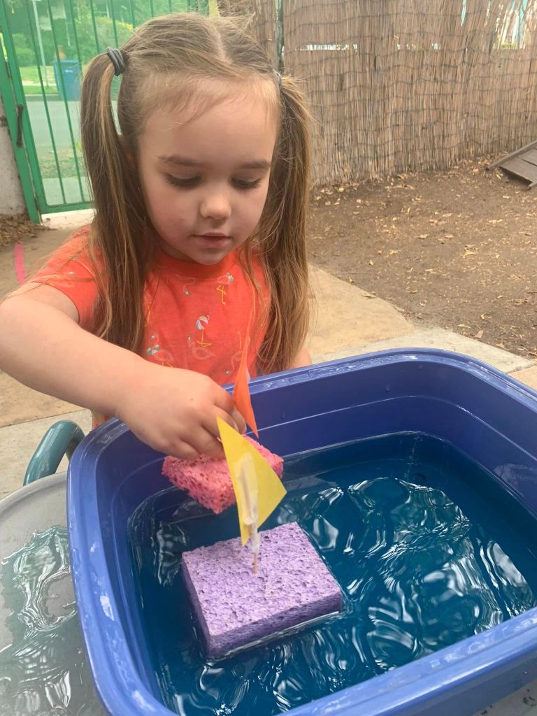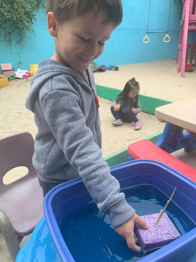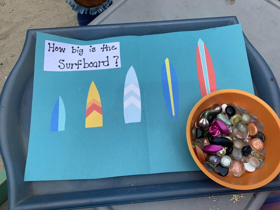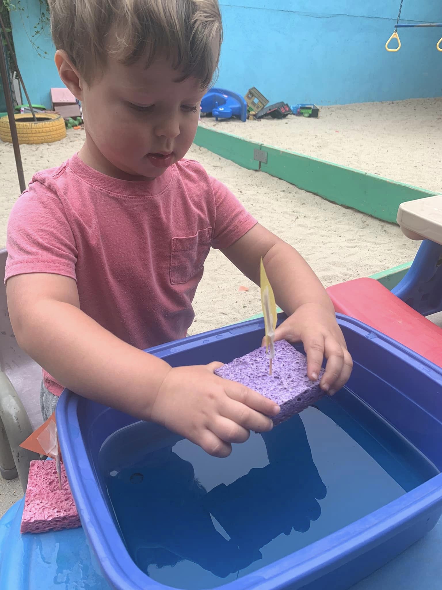 Because we don’t have a real swimming pool, we decided to create one using one of our water tables.