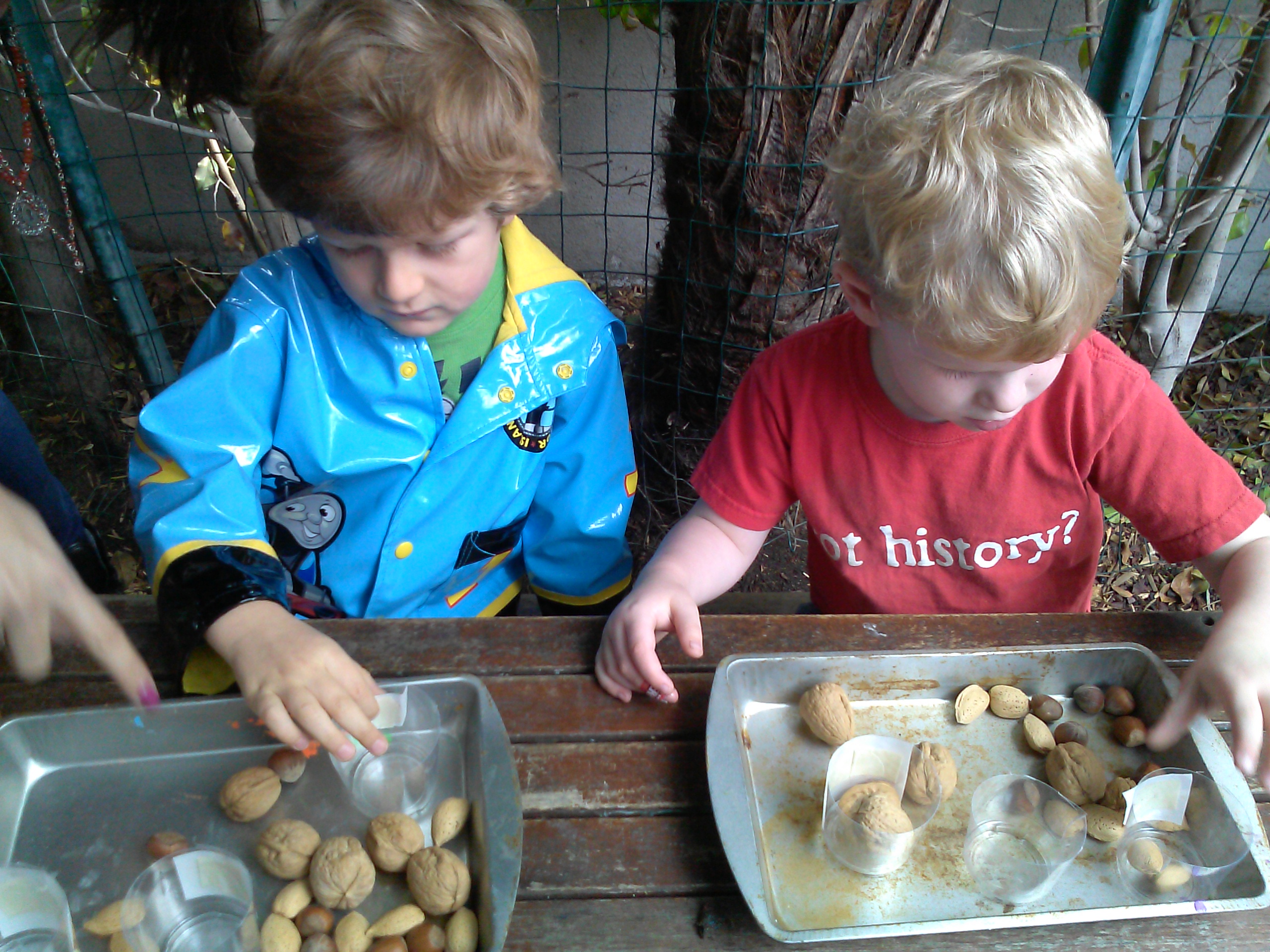 The Wamponoags showed the Pilgrims how to gather nuts during their first winter. Using pictures, and real nuts, we sorted walnuts, almonds, and hazelnuts into three piles. Sorting and classifying objects help children begin to notice how items are alike and different, and creates an awareness that is vital for math learning. Learning to distinguish between things feels like a major accomplishment for preschool children, and using real nuts made the activity that much more fun!