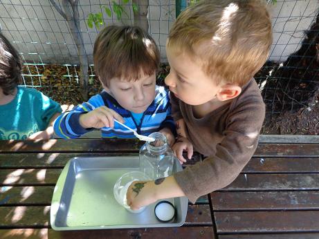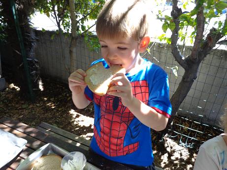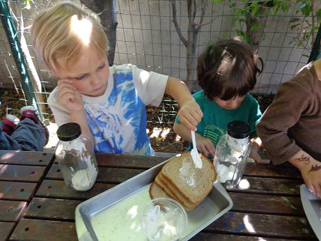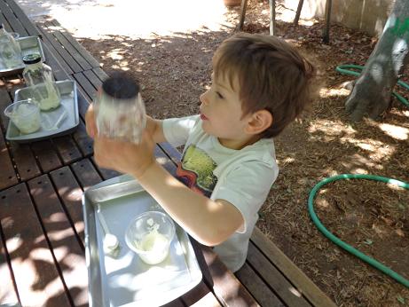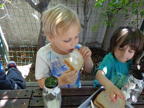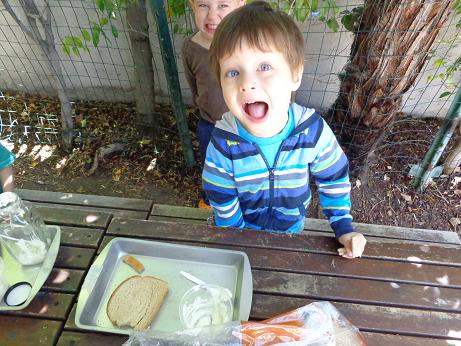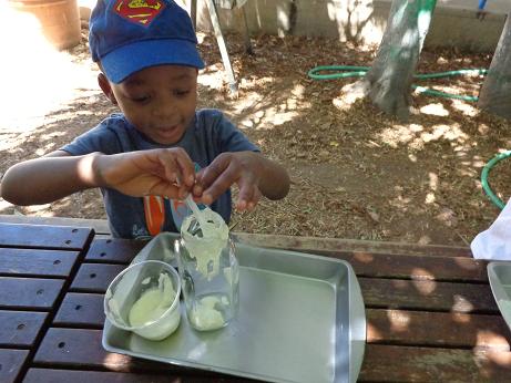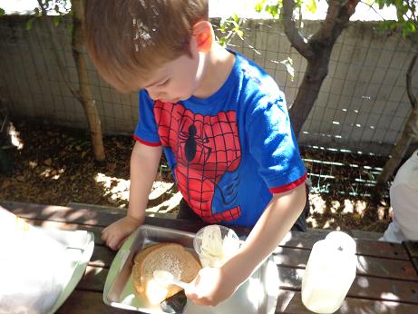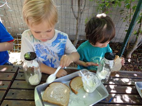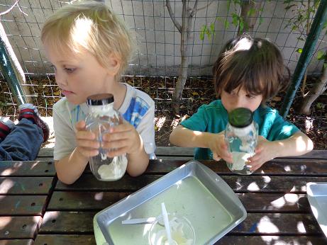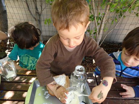 Everyone can appreciate a little butter on their toast in the morning, but did you know that it is thought that the Arabs discovered butter? According to legend, (a long time ago) traders were traveling through the desert on camels. In small leather sacks, they carried milk. The constant rocking motion of the camels churned their milk into butter! To foster your little ones’ natural curiosity, we made our very own butter! Using glass jars, cream, and our strong hands, we enjoyed creating this delicious snack. This activity not only introduced the process of how butter is created, but what it is made of, and the work required to put it on our tables!