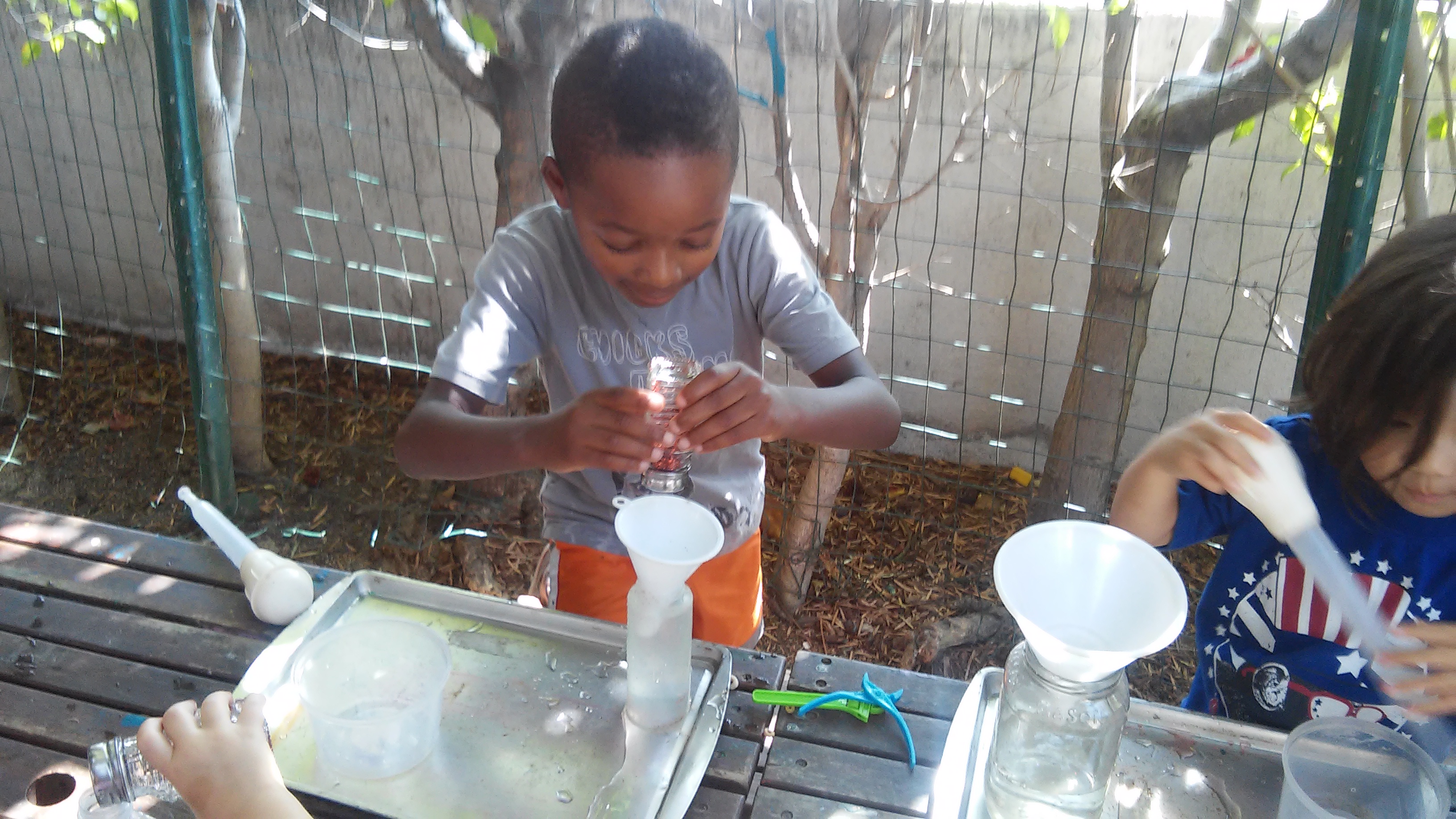 They also learned that the swirling winds of a tornado are called a vortex. Following this brief introduction, they poured water into containers until they were about ¾ full.