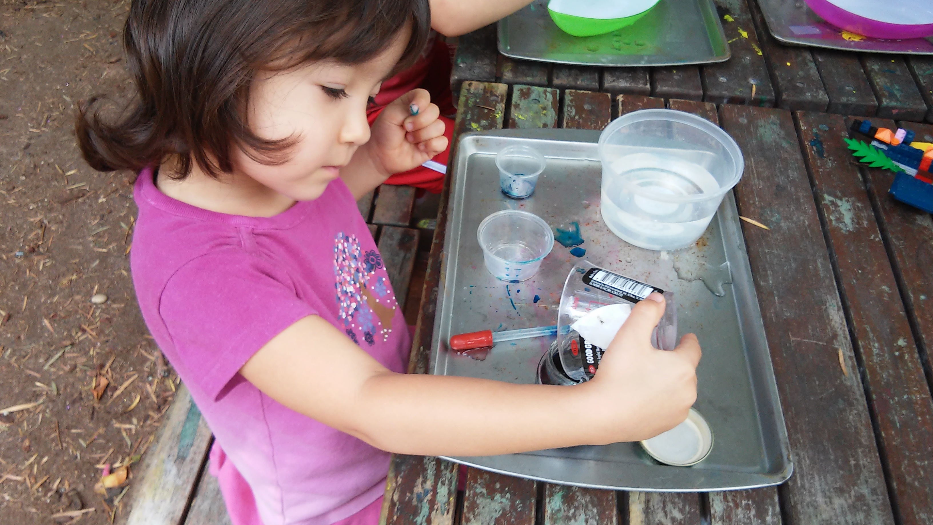 This component of the activity required teamwork. One of the students would hold the bottle, while the other one poured the liquid in. Then we added a few squirts of dish soap.