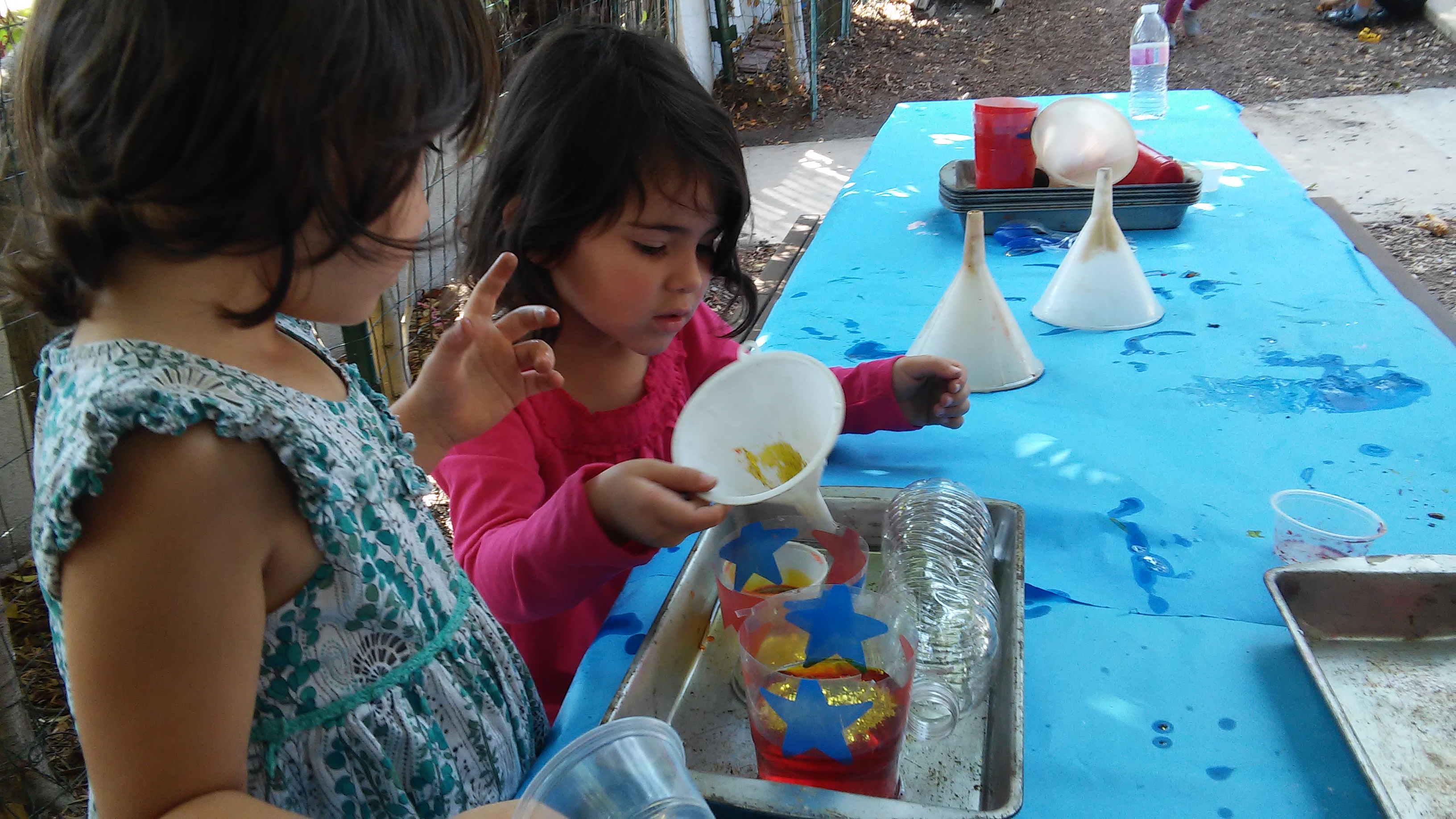 Next, we put the funnel back on to add in some glitter. This made the tornado easier to see. We talked about debris and how tornadoes have high winds that can break things and carry debris to other places.