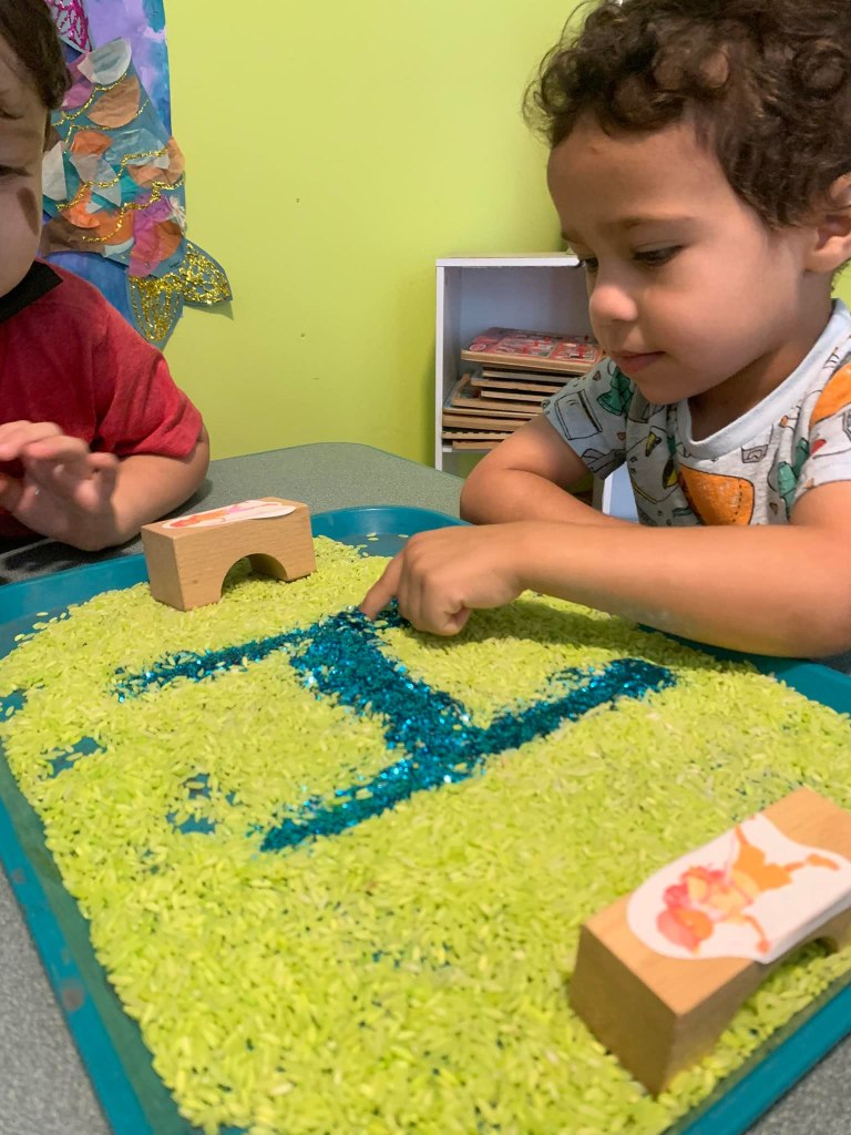 To start our hiking week off with some fun, we integrated this exciting fine motor language activity. At our preschool, we understand that children process information using more senses than just their sight and sound. It is for this reason that we post many sensory activities that focus on the three year olds’ favorite sense: touch! Instead of using a pencil and becoming frustrated, many of our twos and threes use a combination of different fingers to create symbols, such as letters and numbers. What more fun than to accomplish this by tracing the letter H into “grass” aka rice.